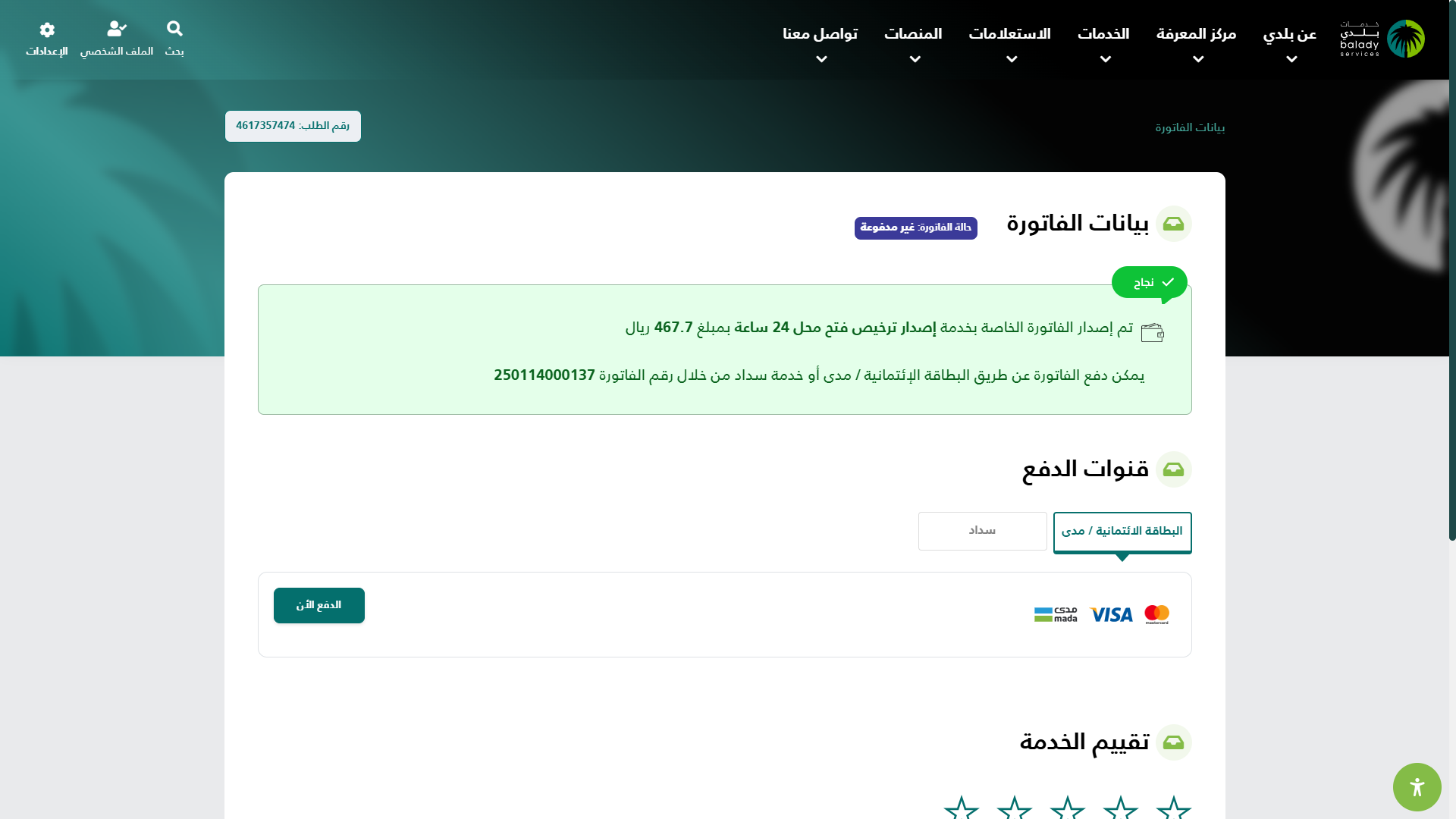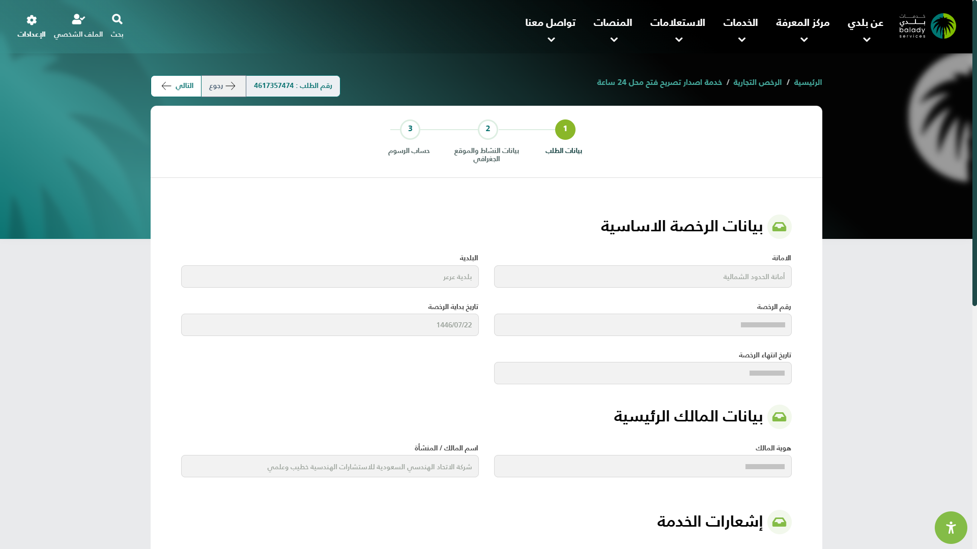 6) الشكل التالي يمثل الجزء الثاني من تفاصيل الطلب، والذي يضم (إشعارات الخدمة) حيث يتم الضغط على الزر (التالي).