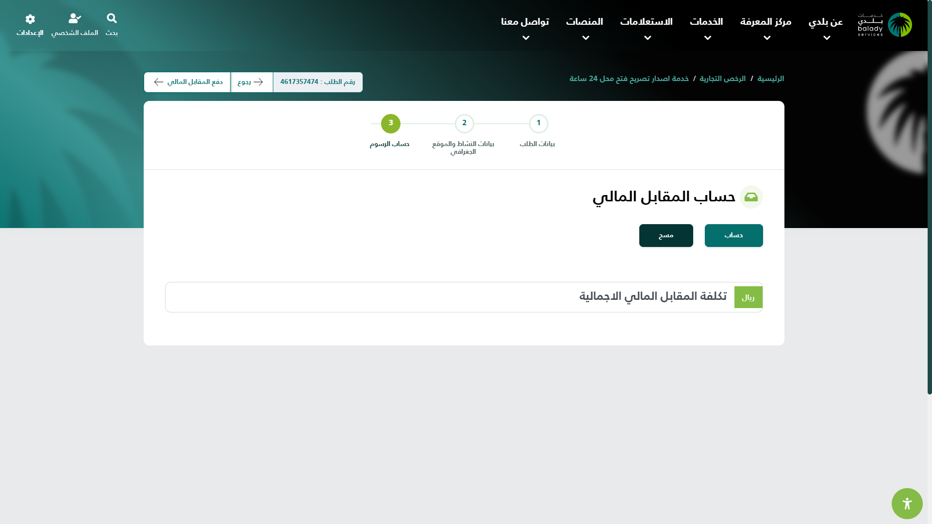8) وبعدها يتم نقل المستخدم لمرحلة (حساب الرسوم) كما في الشكل التالي، حيث يتم الضغط على الزر (حساب) ليقوم النظام بعرض تكلفة المقابل المالي الإجمالية.