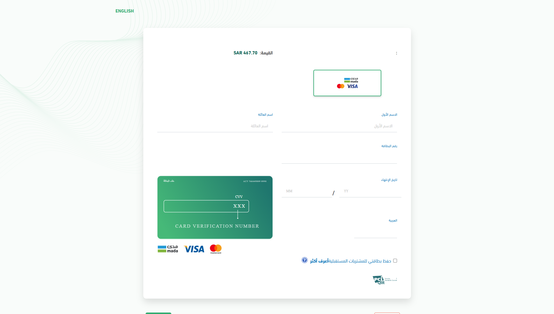 10) وبعدها يتم نقل المستخدم للشاشة أدناه ليتم تعبئة بيانات البطاقة الائتمانية وإكمال إجراءات الدفع.