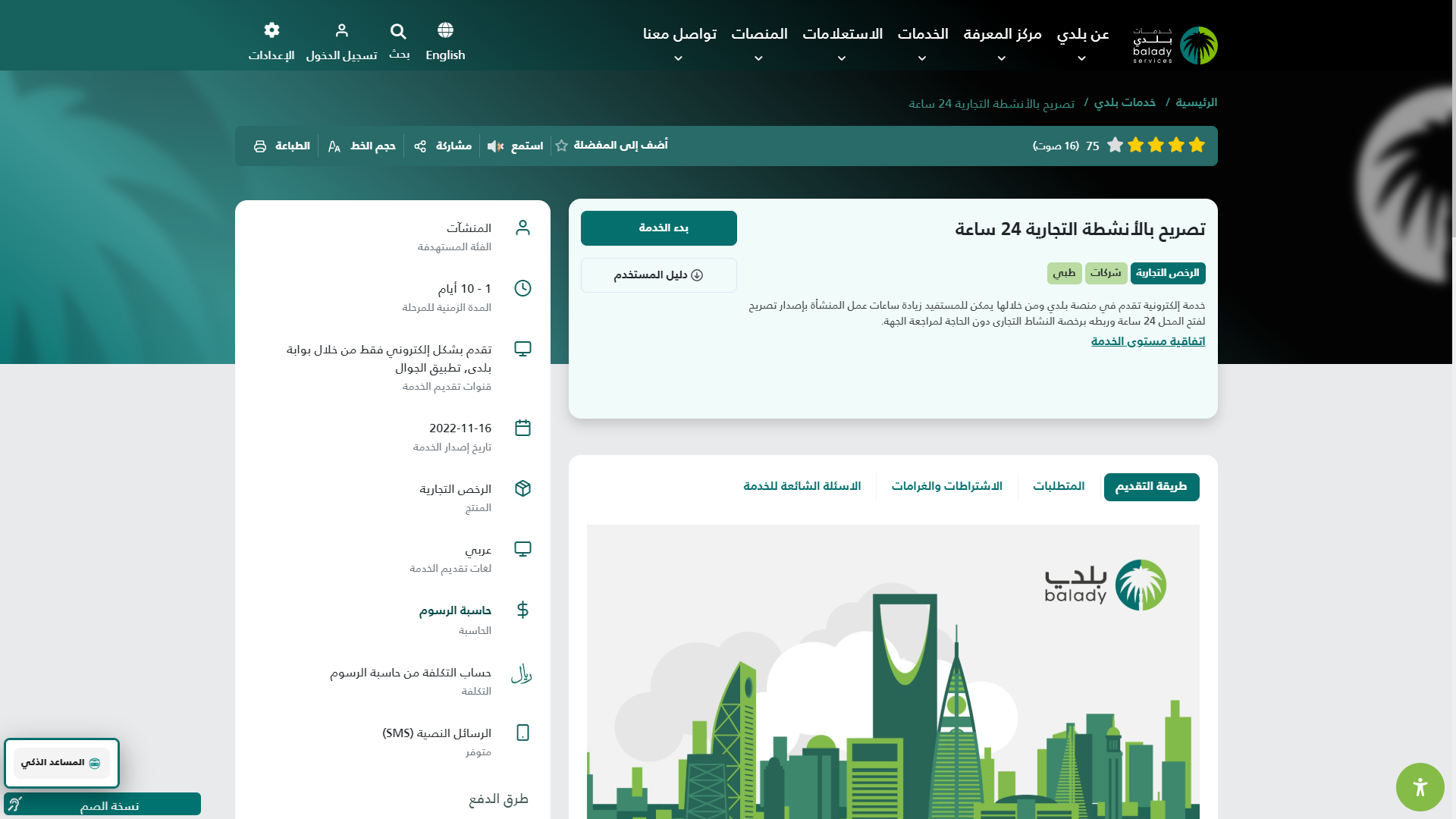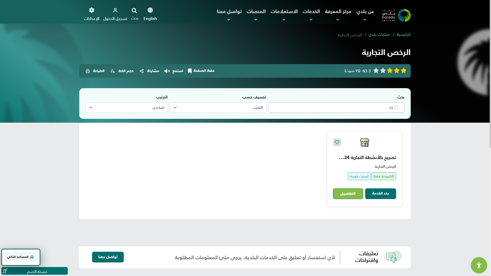 3) وبعدها يتم البحث عن خدمة (تصريح بالأنشطة التجارية 24 ساعة) والضغط على الزر (التفاصيل) كما في الشكل أدناه.