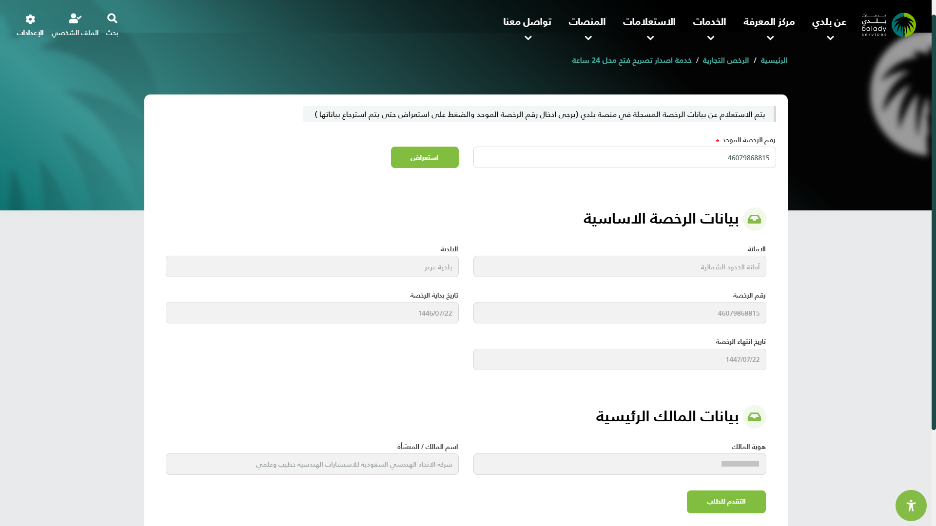5) في حال كان (رقم الرخصة الموحد) المدخل صحيح يتم استرجاع بيانات الرخصة الأساسية كما في الشكل التالي، ويظهر الزر (التقدم للطلب) ليقوم المستخدم بالضغط عليه.