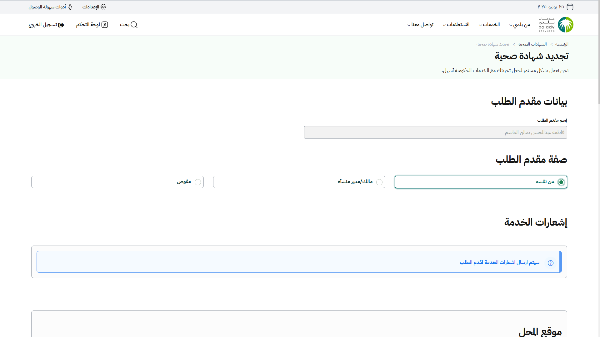 10) في حال تم اختيار صفة مقدم الطلب (عن نفسه) يقوم النظام بإظهار قسم (إشعارات الخدمة).