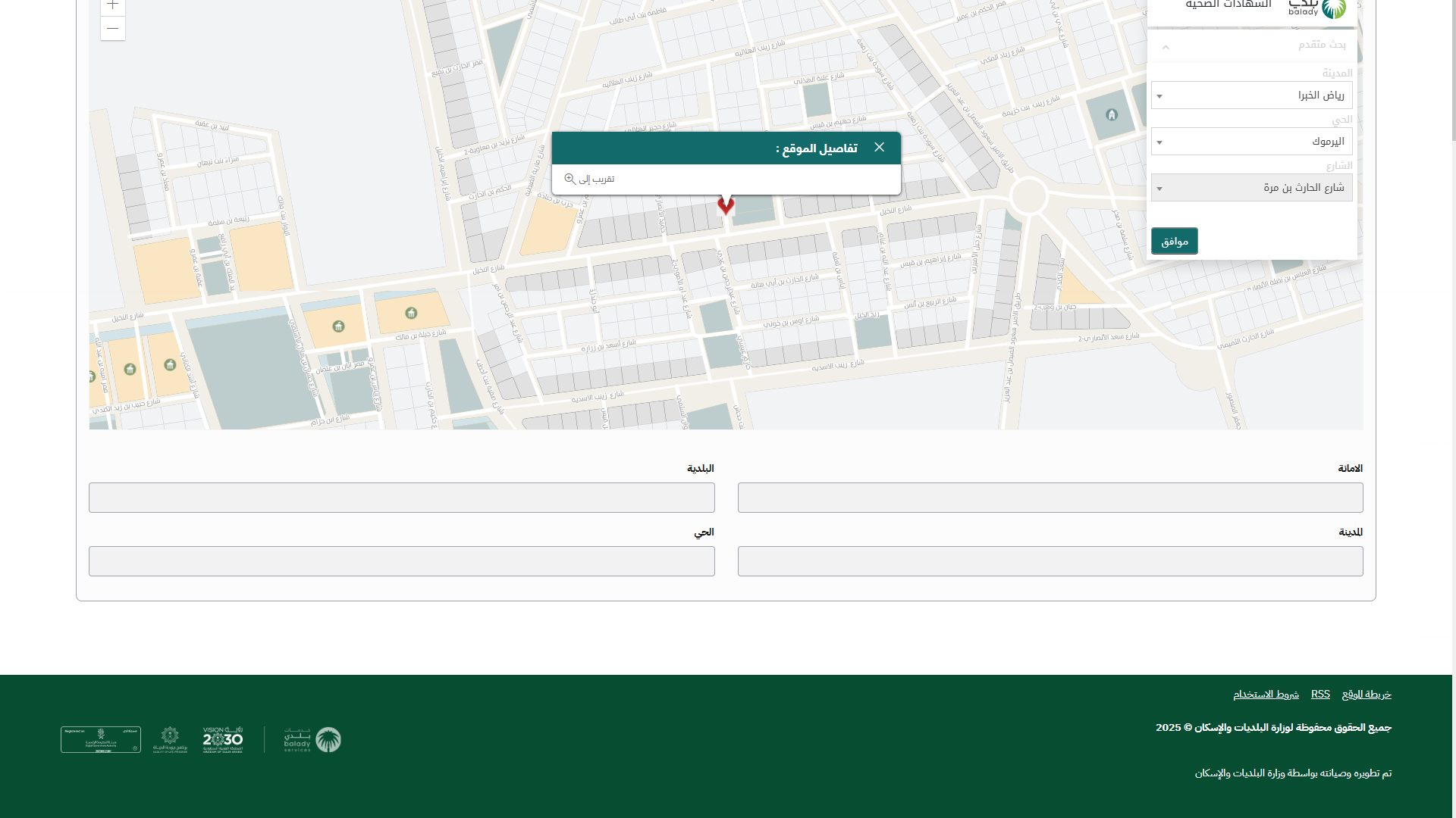 23) وبعدها يقوم النظام بتعبئة قيم الحقول التالية (الأمانة، البلدية، المدينة، الحي).