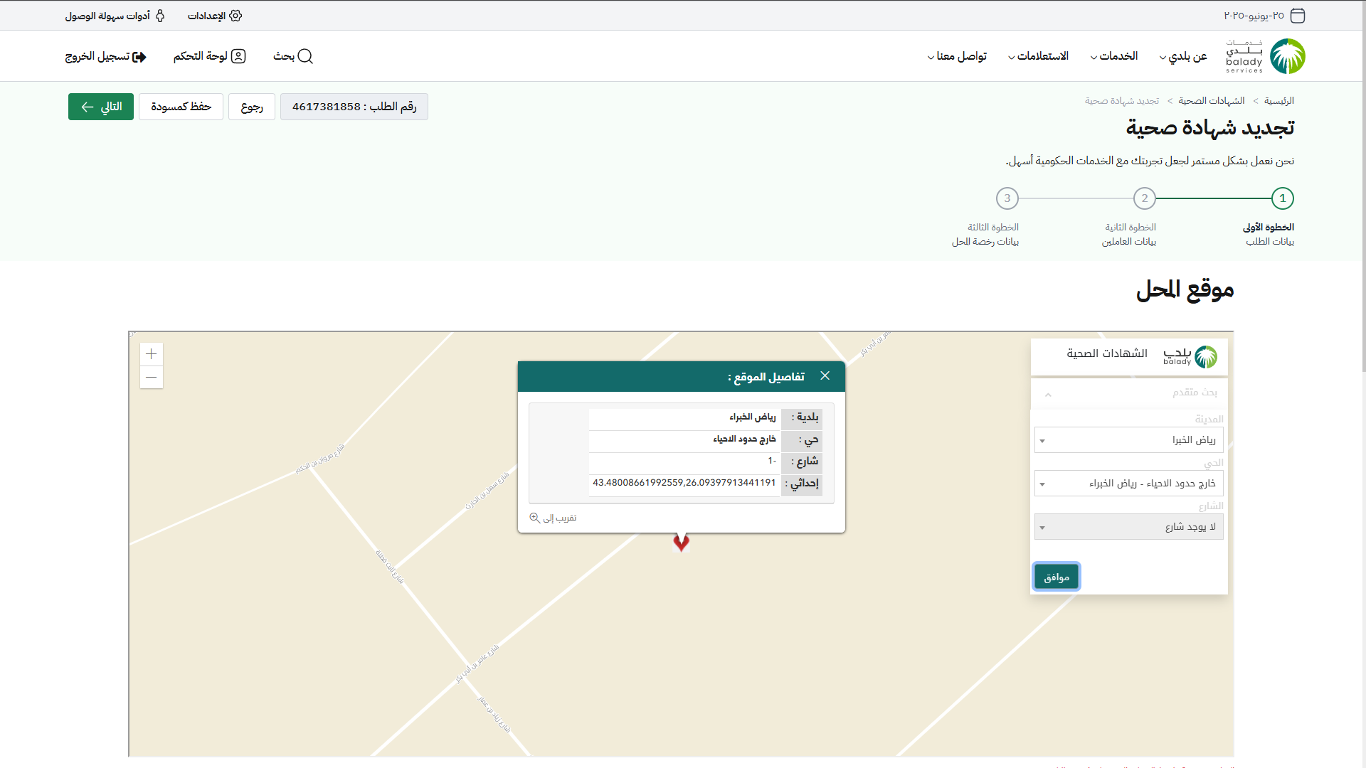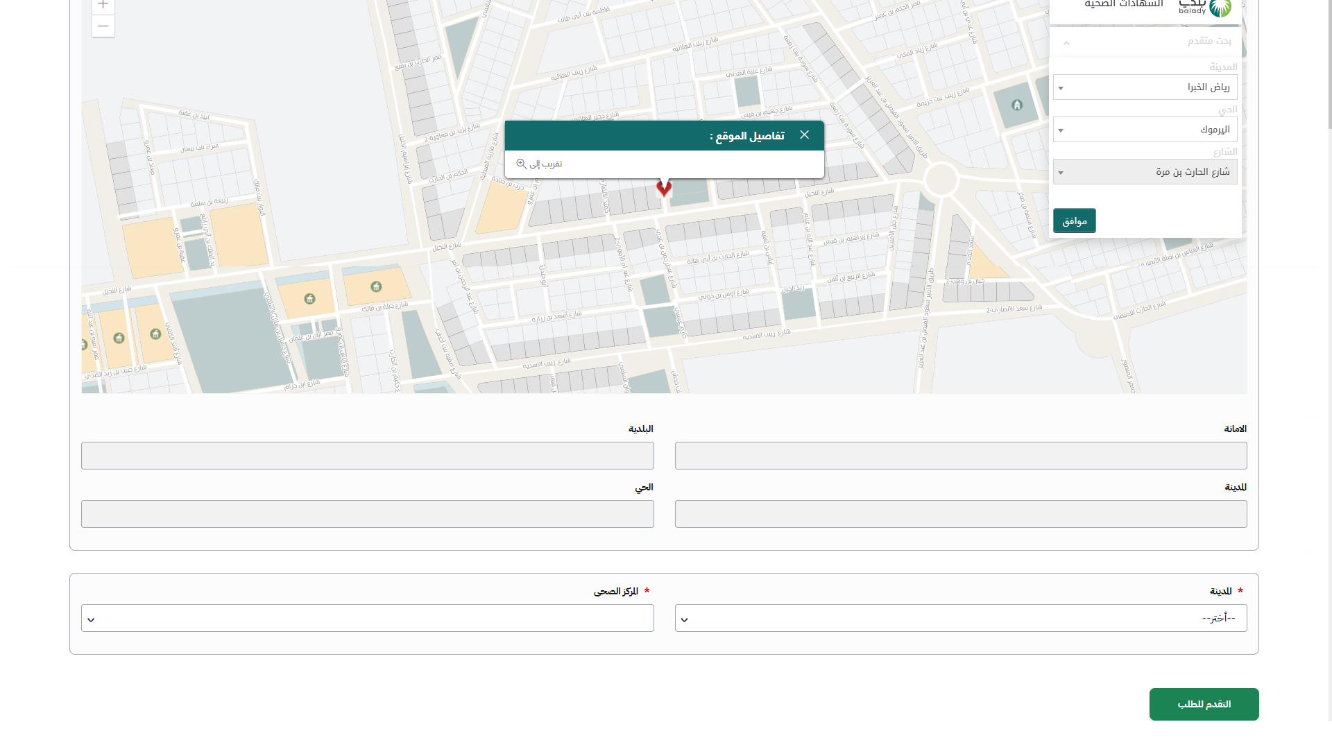 كما يمكن للمستخدم تحديد موقع آخر من خلال اختيار قيم القوائم المنسدلة (المدينة، الحي، الشارع) على التوالي، ثم يتم الضغط على الخريطة لتحديد الموقع، ثم يتم الضغط على الزر (موافق).