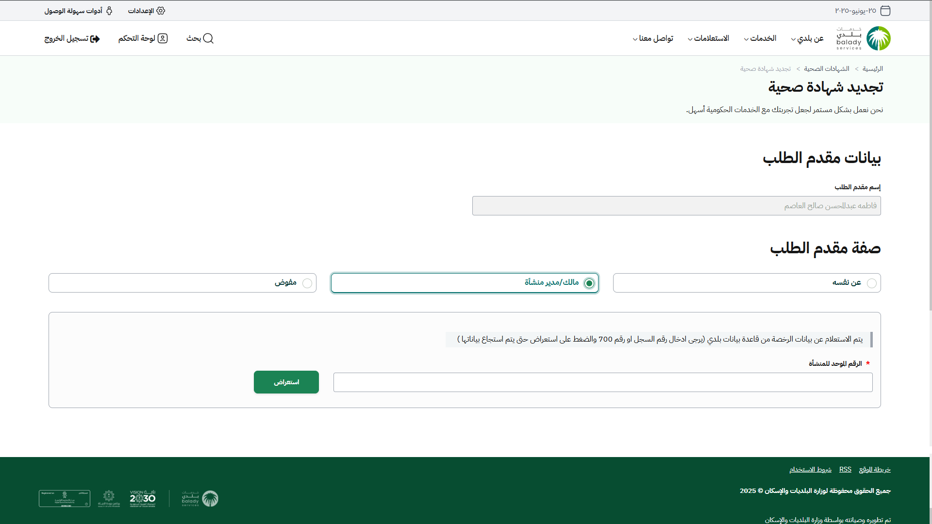 13) في حال اختيار صفة مقدم الطلب هو (مالك/مدير منشأة)، يظهر حقل باسم (الرقم الموحد للمنشأة) حيث يتم تعبئته ثم الضغط على الزر (استعراض).