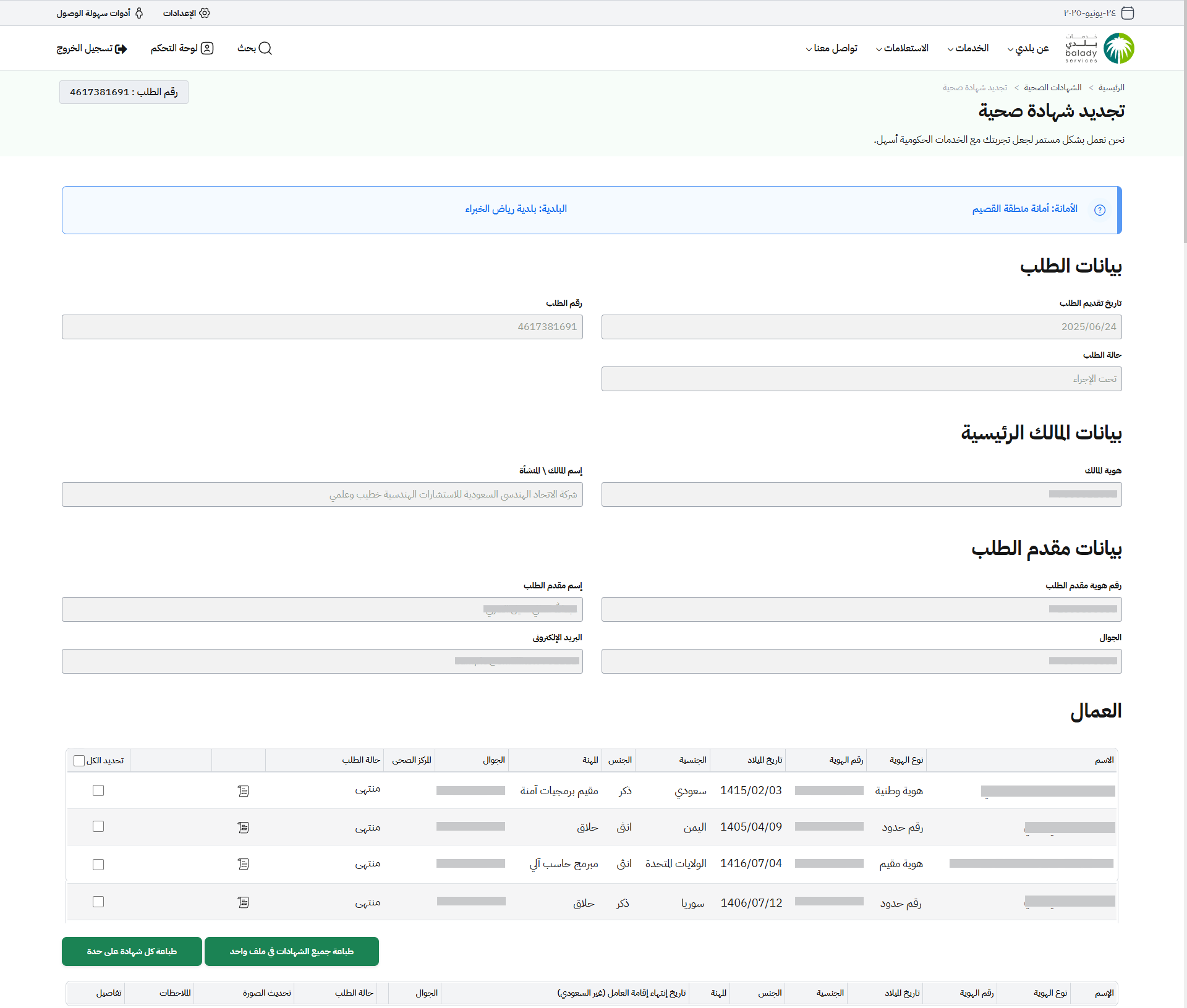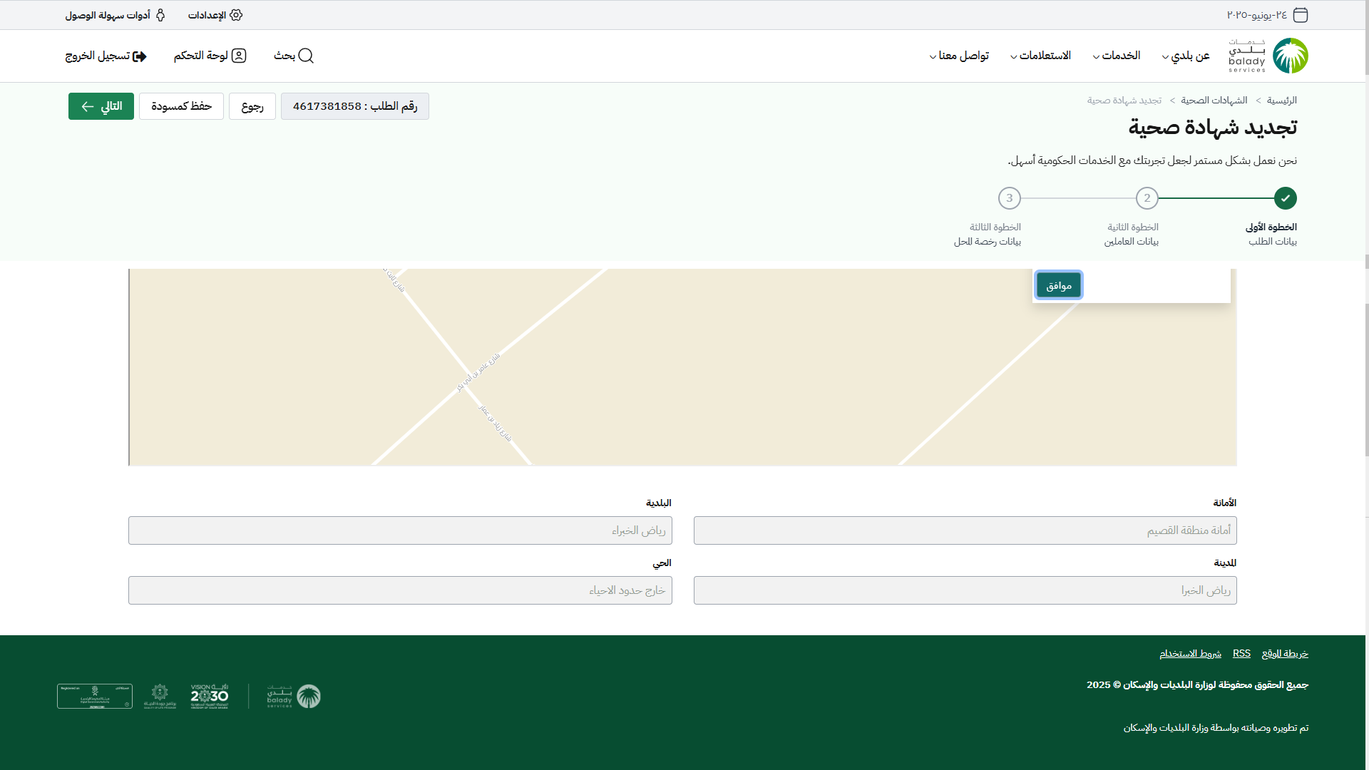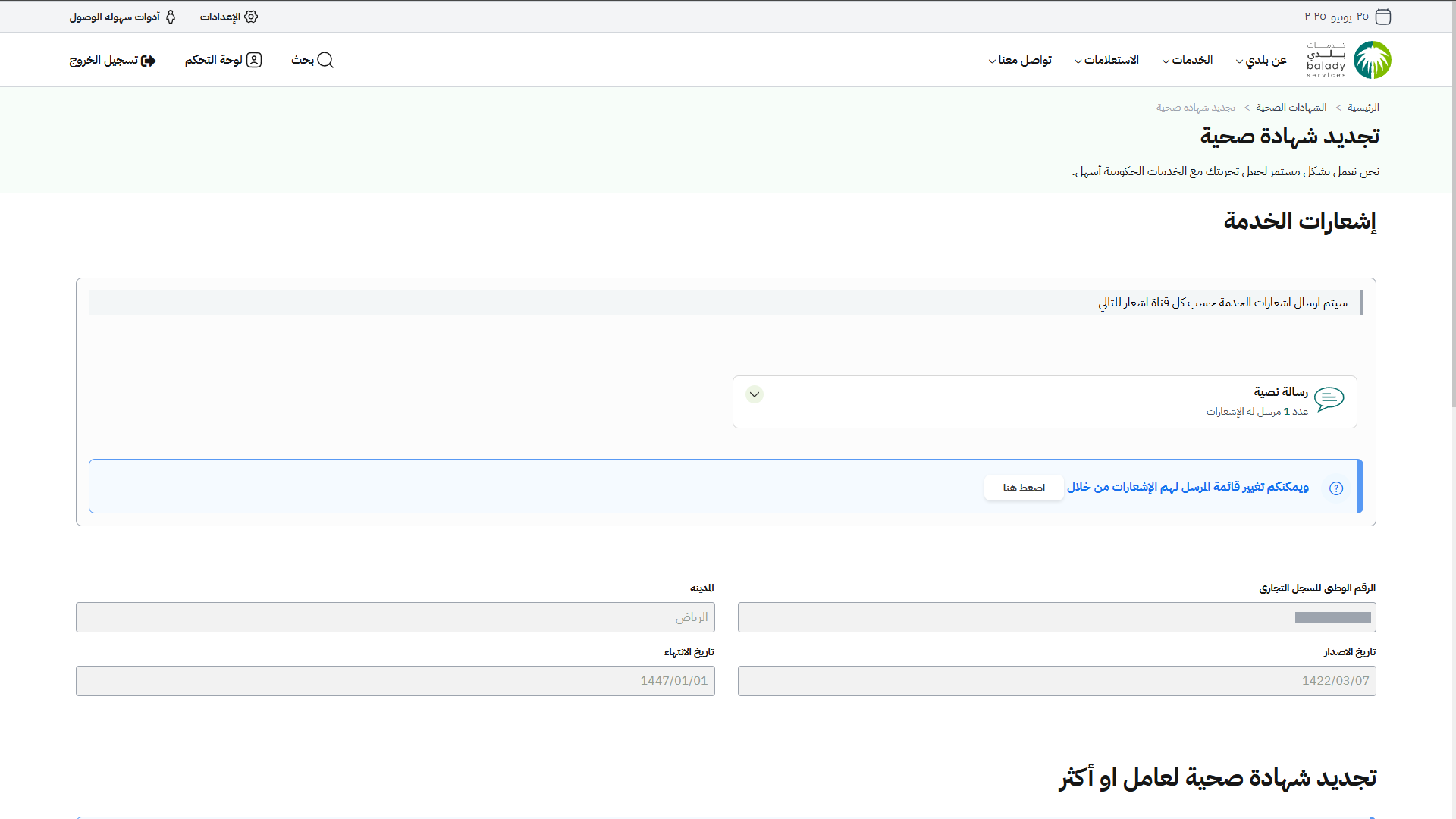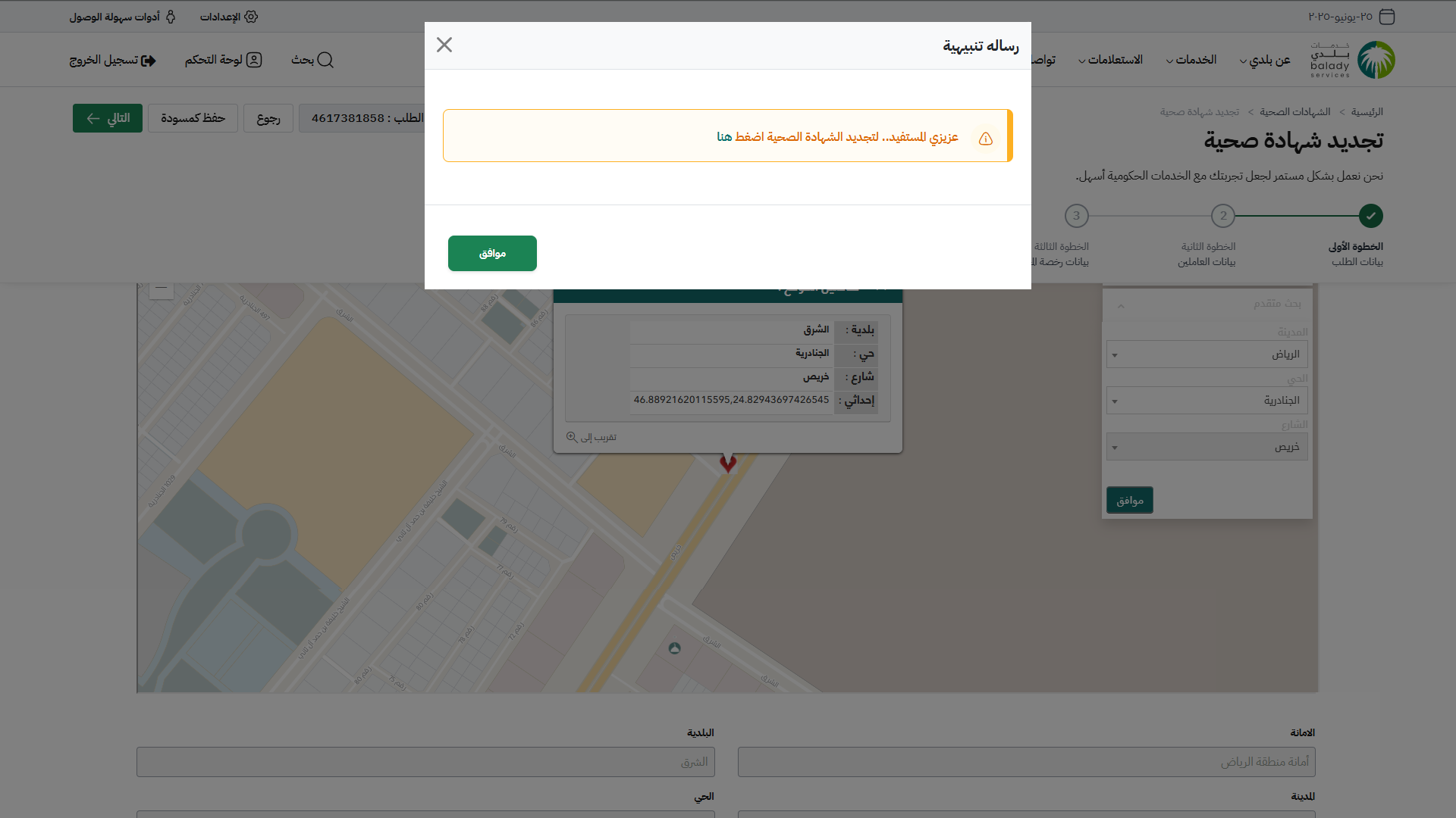 21) في حال اختيار أمانة (الرياض) تظهر رسالة تنبيه ليتم تجديد الشهادة الصحية من خلال الضغط على الرابط (هنا).