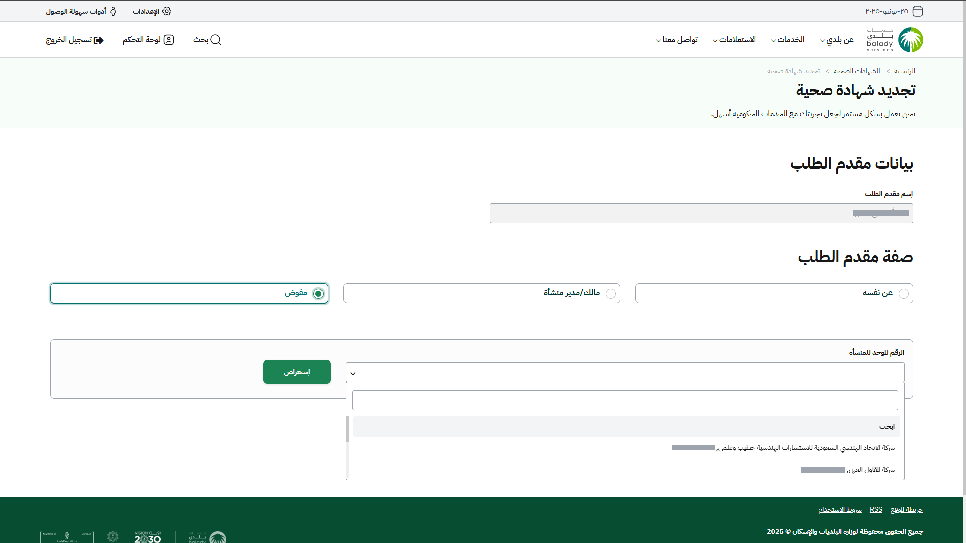 16) في حال اختيار صفة مقدم الطلب هو (مفوض)، يظهر حقل باسم (الرقم الموحد للمنشأة) حيث يتم اختيار السجل من القائمة المنسدلة ثم الضغط على الزر (استعراض).