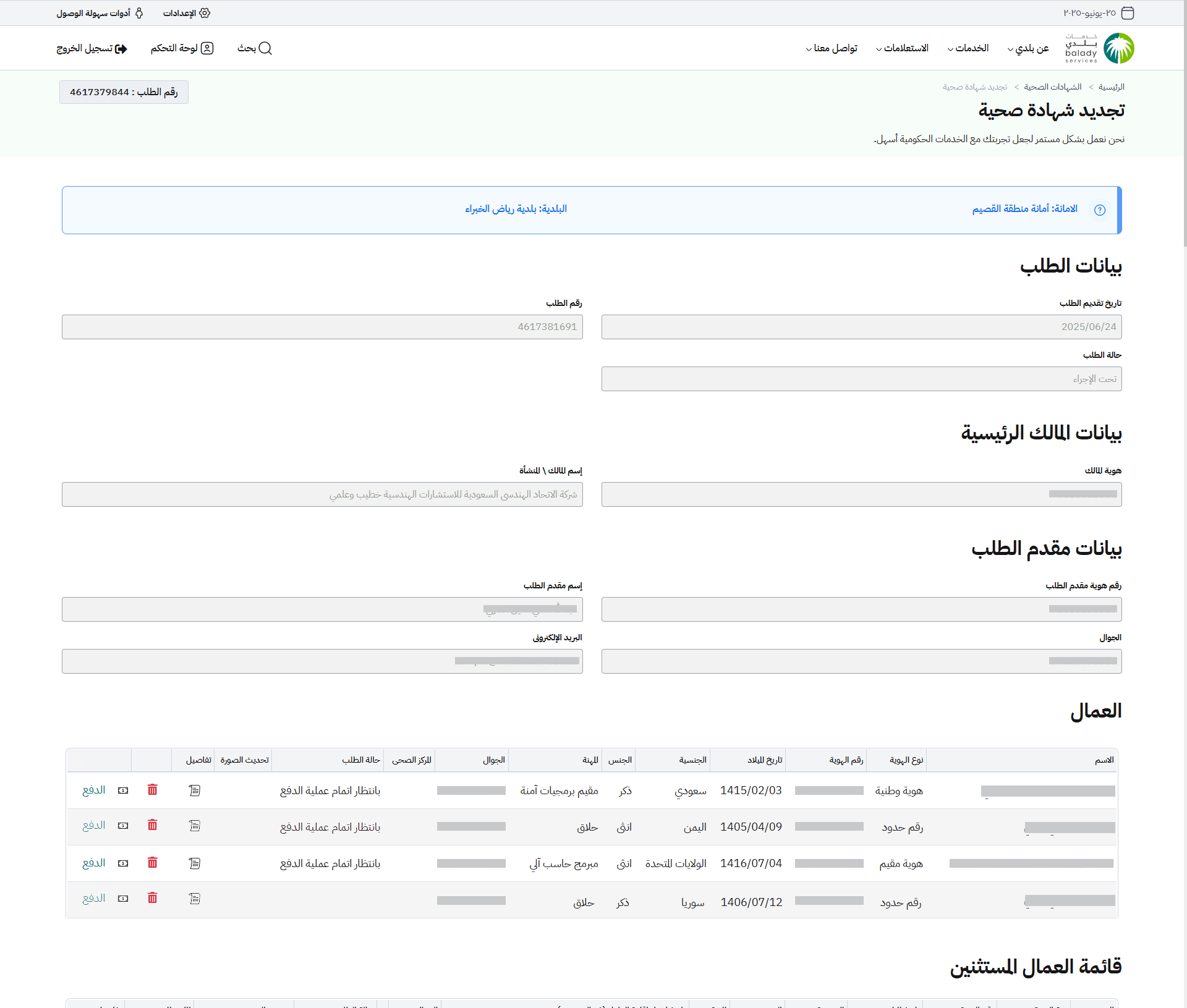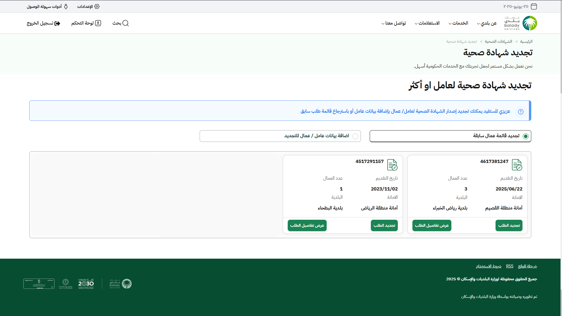 15) وفي الجزء الثاني من الشاشة يظهر قسم (تجديد شهادة صحية لعامل أو أكثر)، حيث يمكن للمستخدم تجديد الطلب من قائمة (تجديد قائمة عمال سابقة) مع إمكانية إضافة عامل جديد من قائمة (اضافة بيانات عامل / عمال للتجديد).