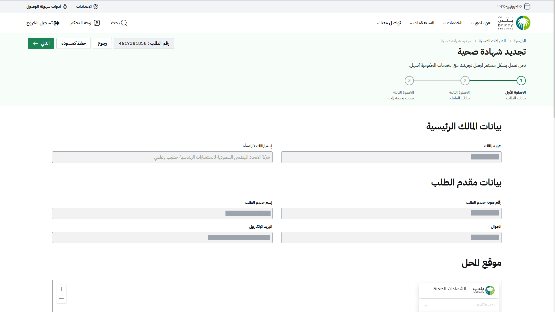 19) ثم يتم نقل المستخدم لمرحلة الخطوة الأولى (بيانات الطلب) حيث يتم استعراض (بيانات المالك الرئيسية، بيانات مقدم الطلب).
