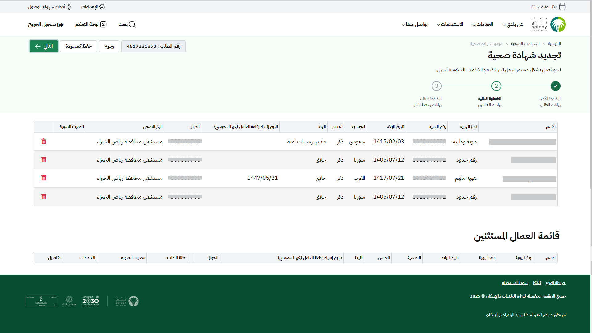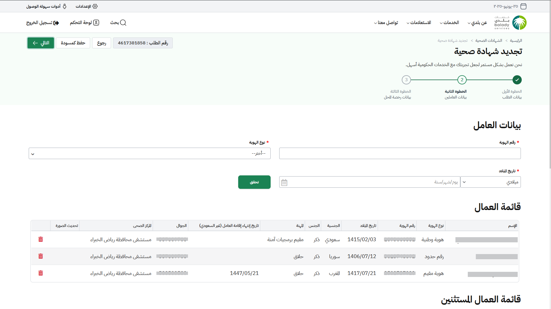 24) ثم ينتقل المستخدم لمرحلة الخطوة الثانية (بيانات العاملين) ليقوم المستخدم بالتأكد من (قائمة العمال) ، كما يمكن للمستخدم اضافة عامل جديد بتعبئة قيم الحقول في القسم (بيانات العامل)، وتشمل (رقم الهوية، نوع الهوية (هوية وطنية / هوية مقيم / رقم الحدود)، تاريخ الميلاد)، ثم الضغط على الزر (تحقق)، من أجل التحقق من بيانات العامل.