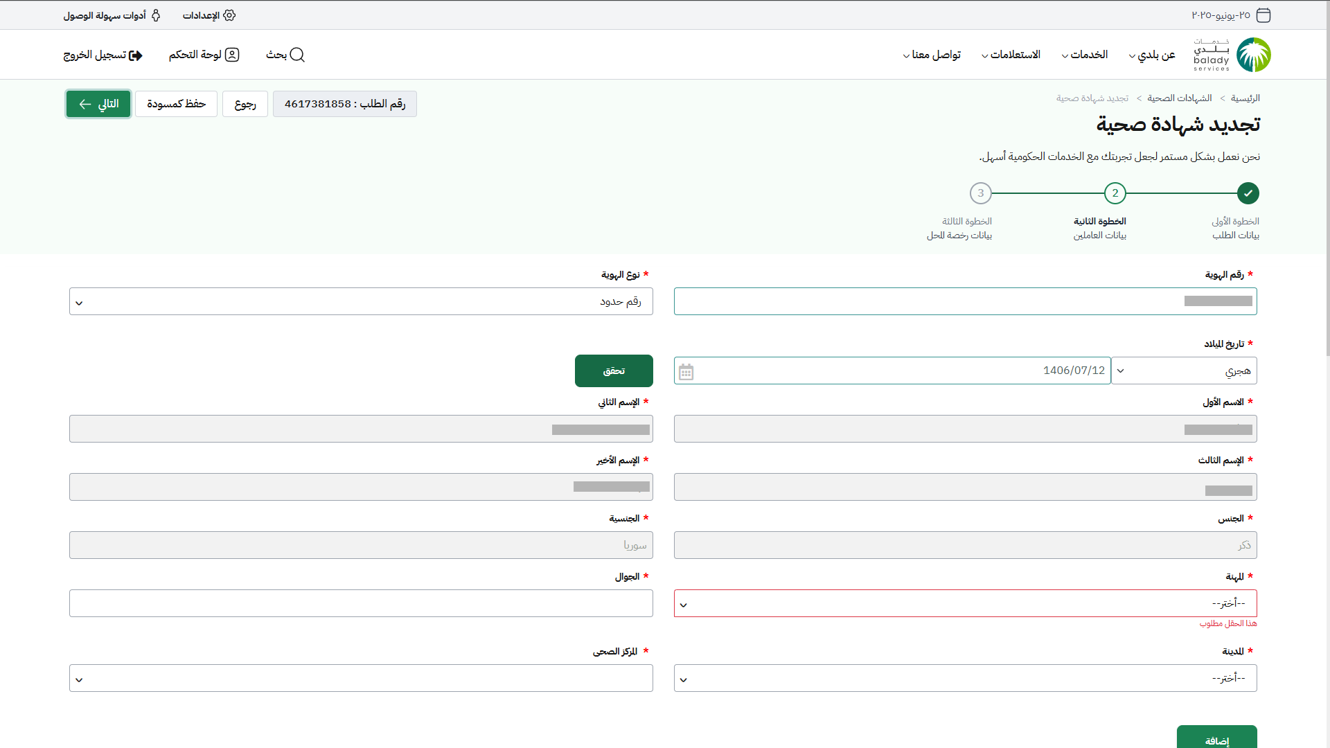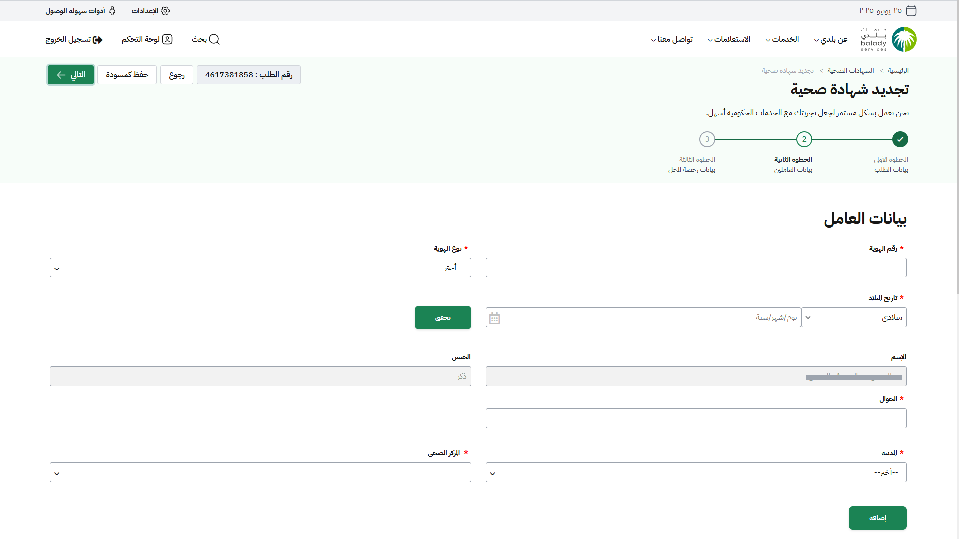 25) وبعدها يتم استرجاع بيانات العامل، في حال كانت القيم المدخلة صحيحة. حيث يتم إدخال قيمة الحقل (الجوال) واختيار (المدينة، المركز الصحي) من القوائم المنسدلة على التوالي.