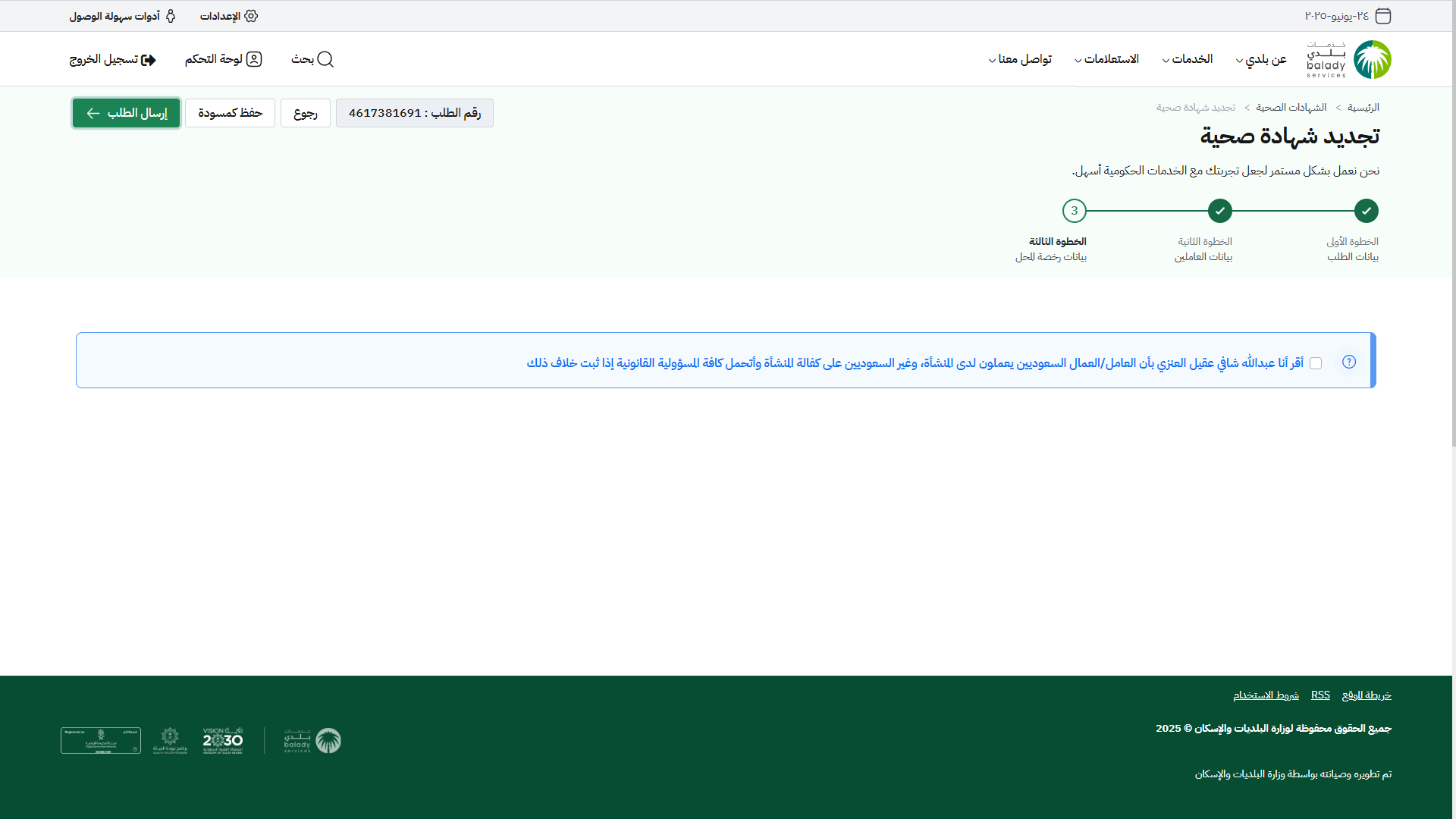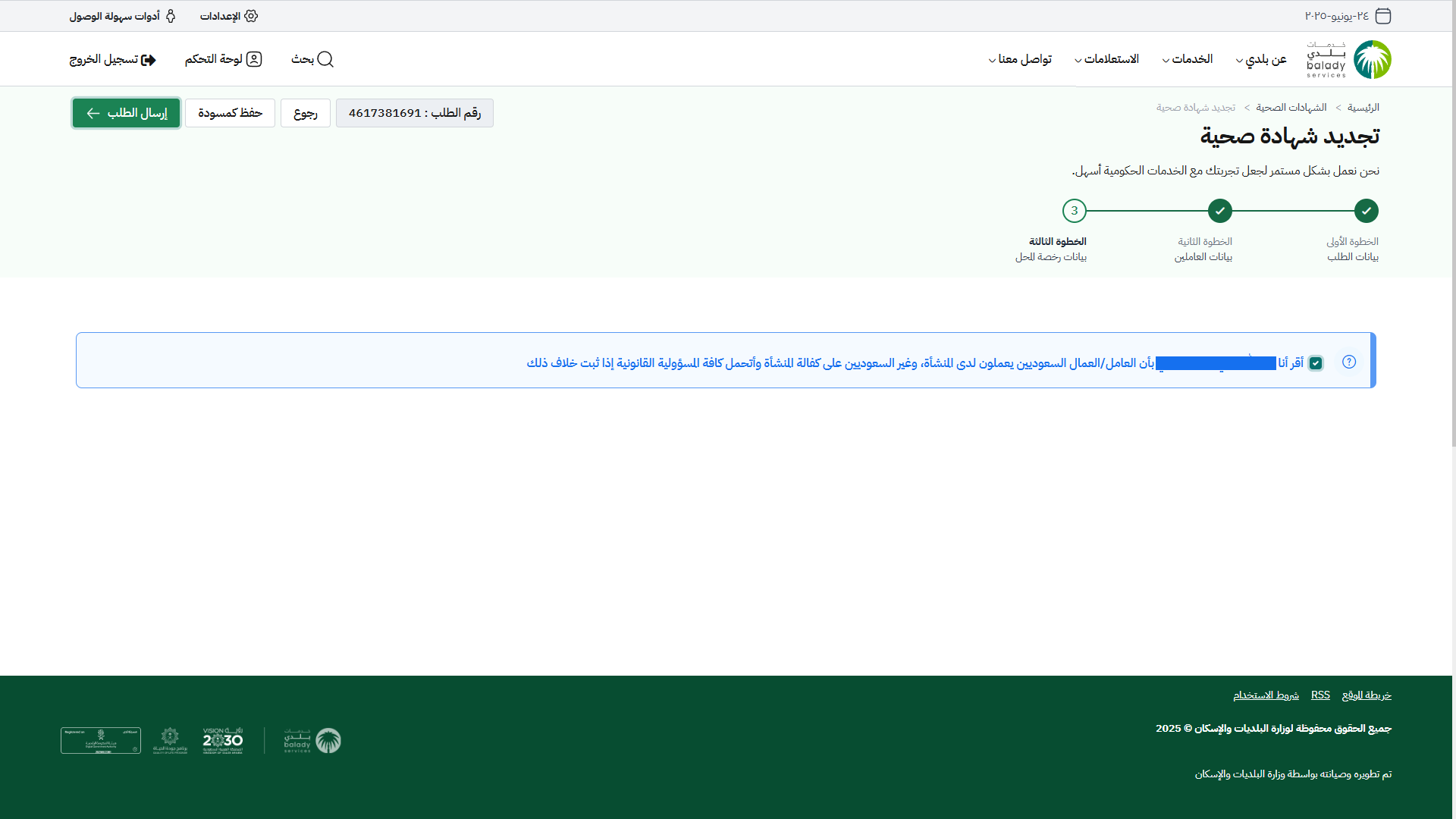 28) ثم يتم نقل المستخدم لمرحلة الخطوة الثالثة (بيانات رخصة المحل)، كما في الشكل التالي، حيث يقوم المستخدم بالموافقة على الإقرار بالتعهد على أن (العامل/العمال السعوديين يعملون لدى المنشأة، وغير السعوديين على كفالة المنشأة).
