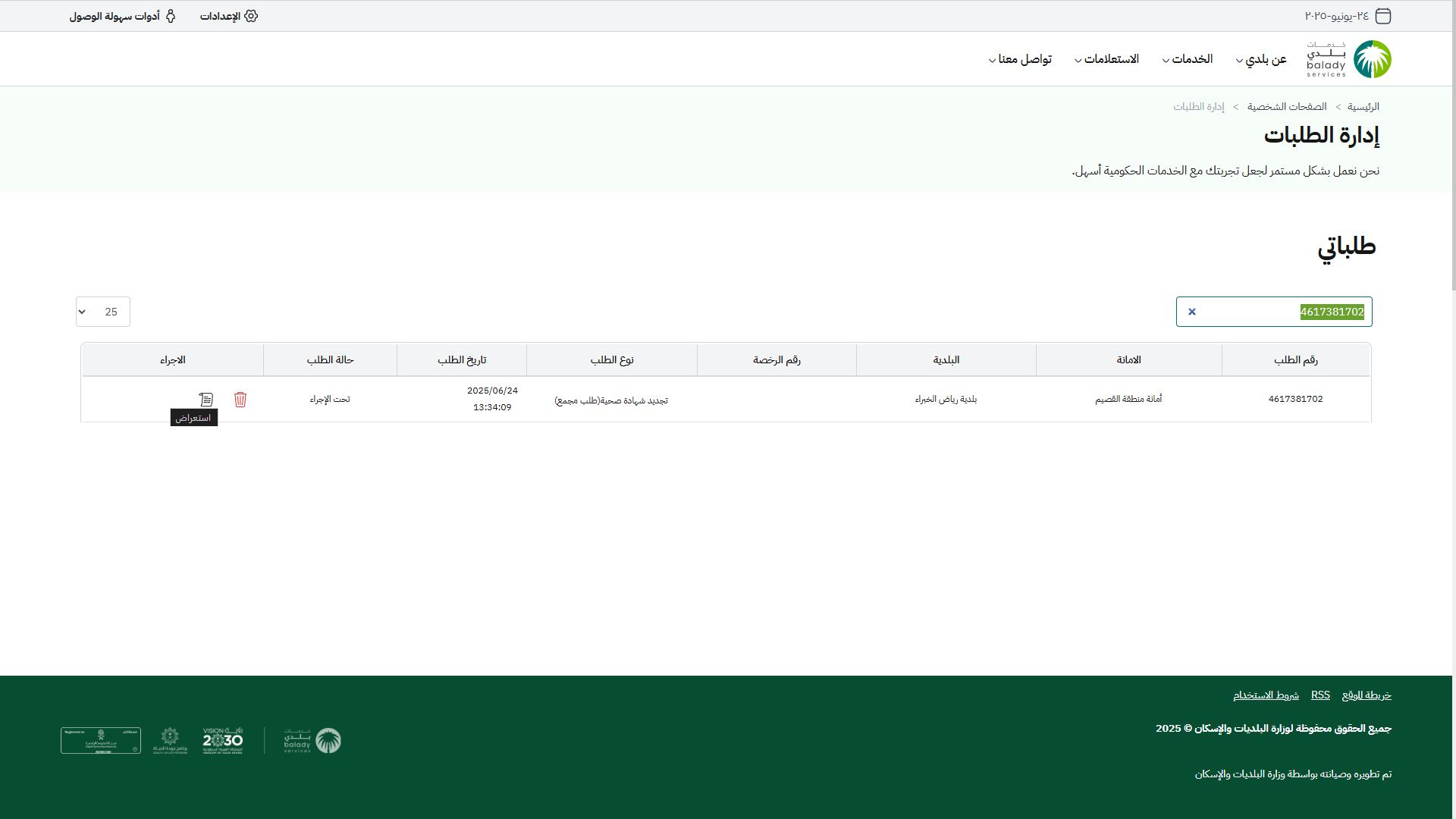 32) وبعد الضغط على رمز الورقة (استعراض) في عمود (الإجراء)، يتم عرض تفاصيل الطلب كما في الشكل التالي.