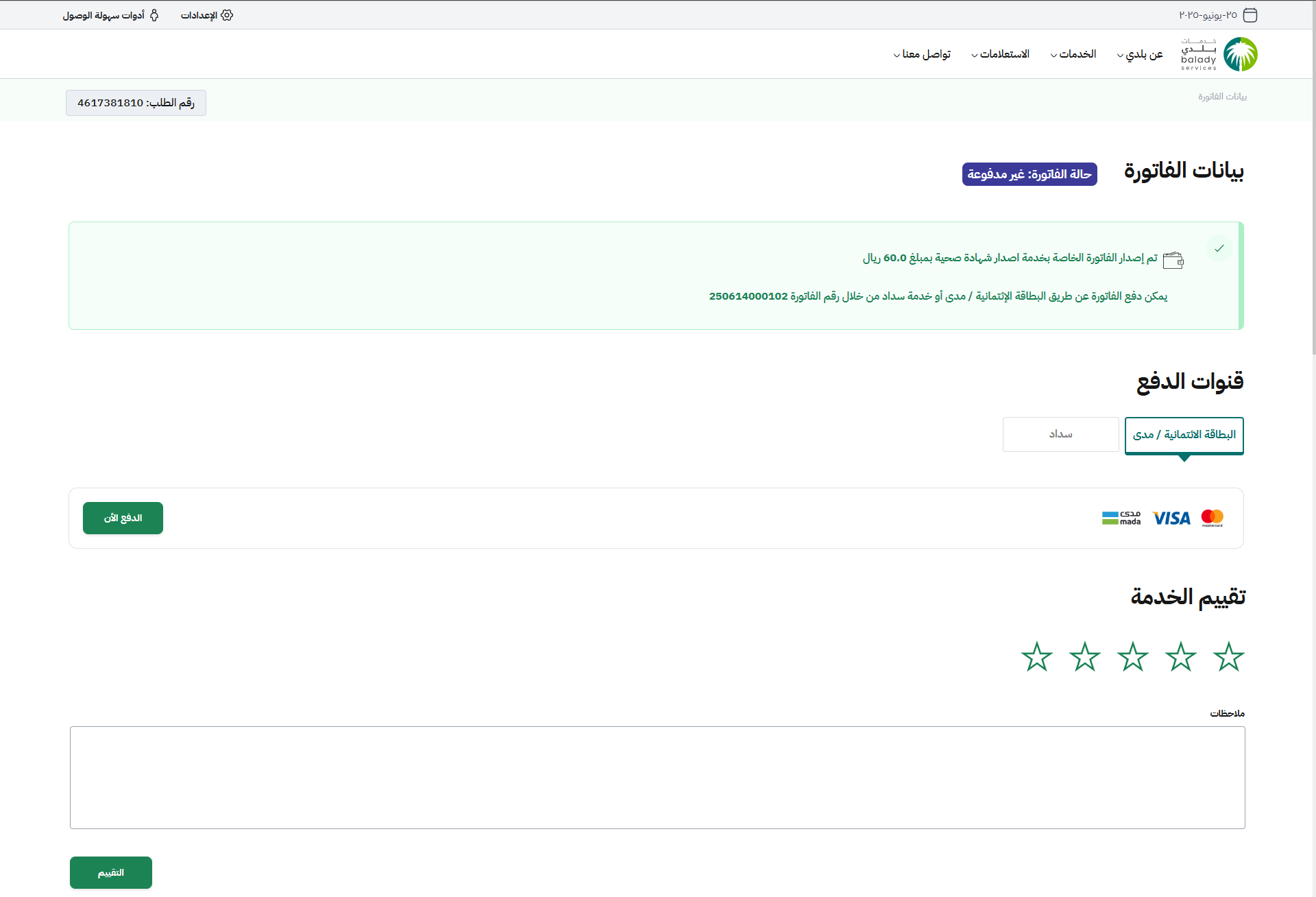 33) وبعدها يتم عرض بيانات فاتورة السداد كما يلي، حيث يختار المستخدم أحد قنوات الدفع التالية (البطاقة الائتمانية/مدى، سداد).