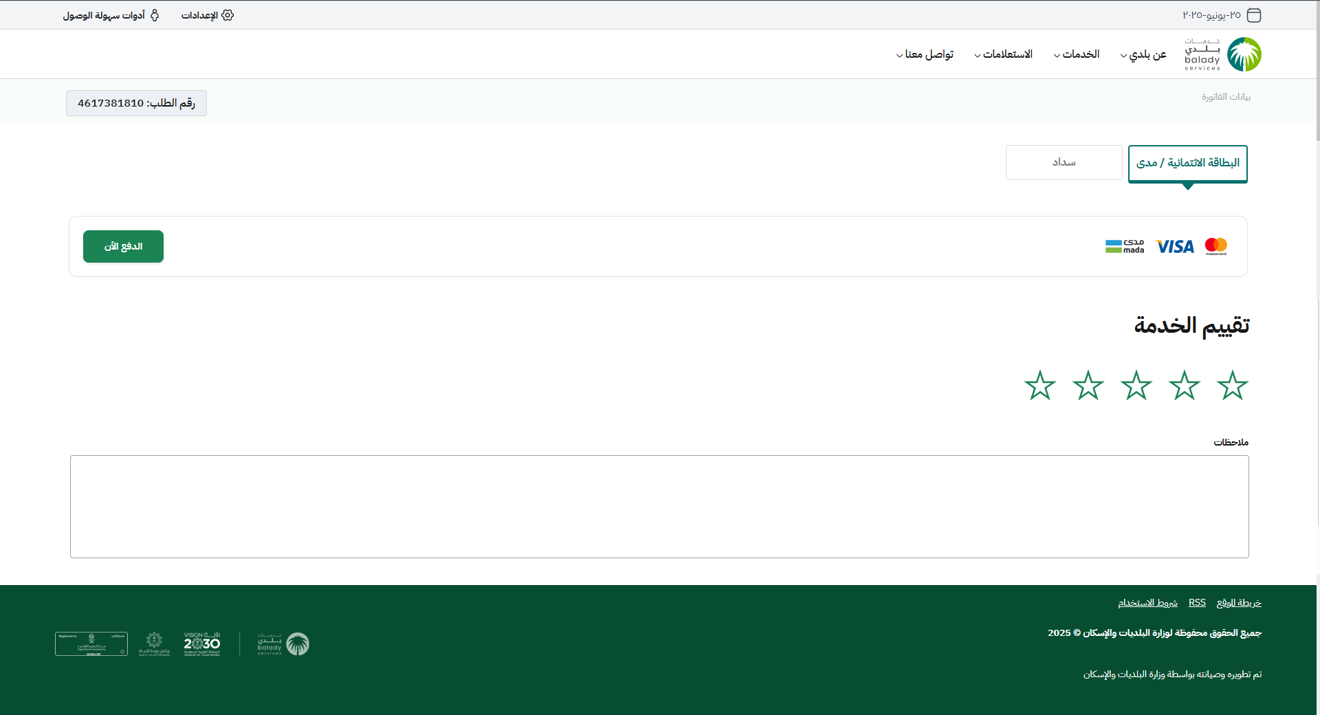 في حال اختيار (البطاقة الائتمانية/مدى) يتم الضغط على الزر (الدفع الآن) لاستكمال إجراءات الدفع.