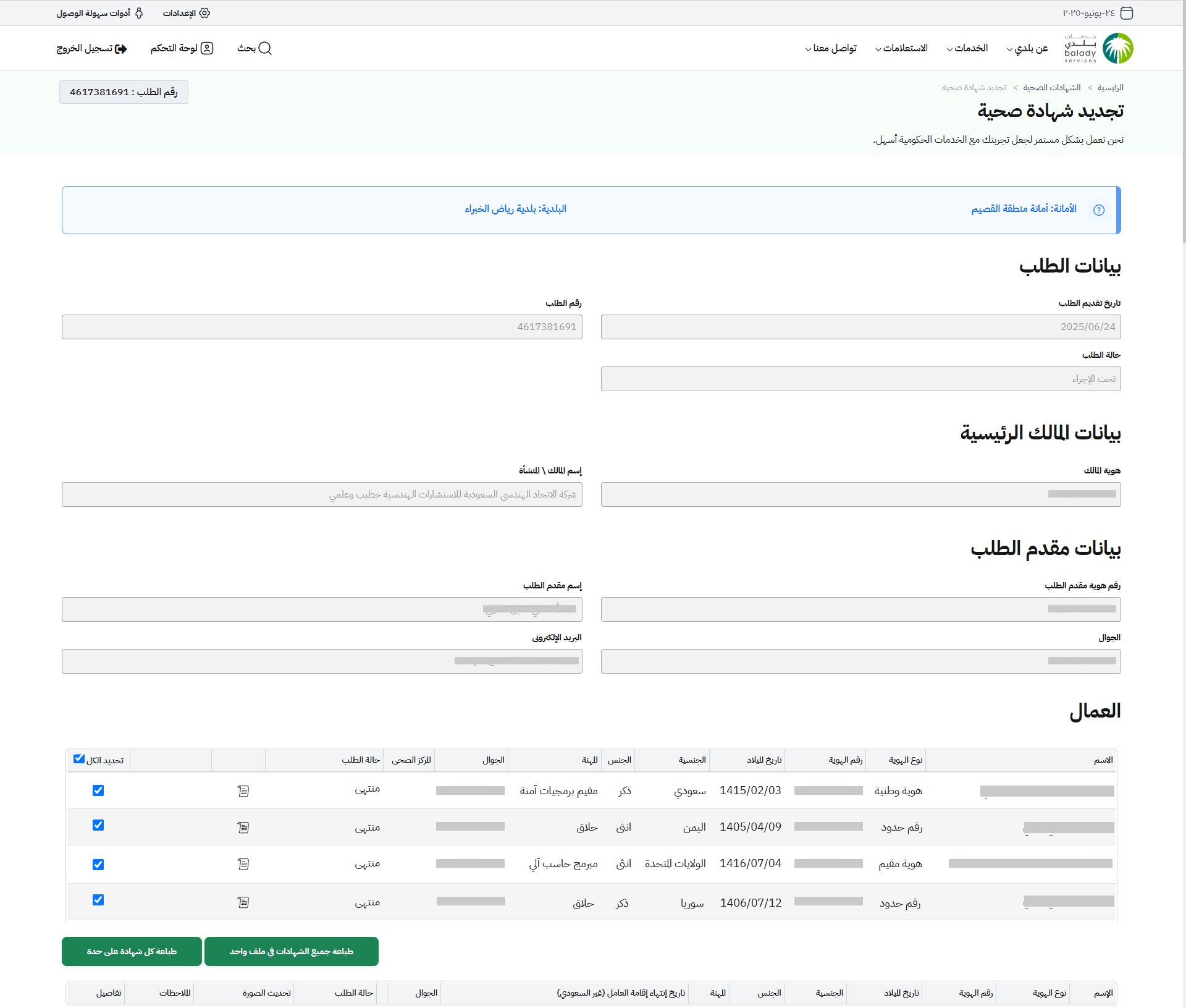 41) يظهر في الشكل التالي أنه تم اختيار جميع العمال في الجدول، وسيتم الضغط على الزر (طباعة جميع الشهادات في ملف واحد).
