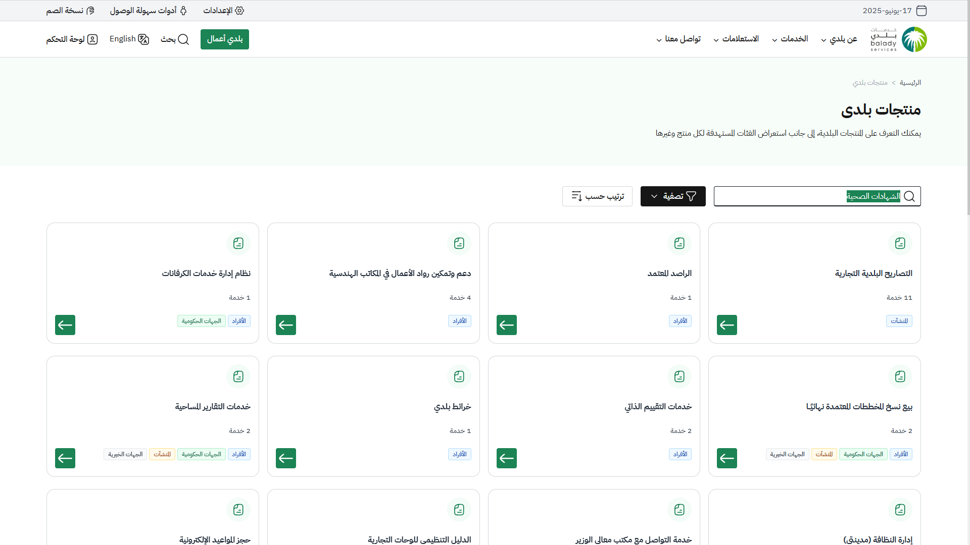 5) يتم عرض قائمة (منتجات بلدي)،حيث يقوم المستخدم بالبحث عن منتج (الشهادات الصحية) من خانة البحث .