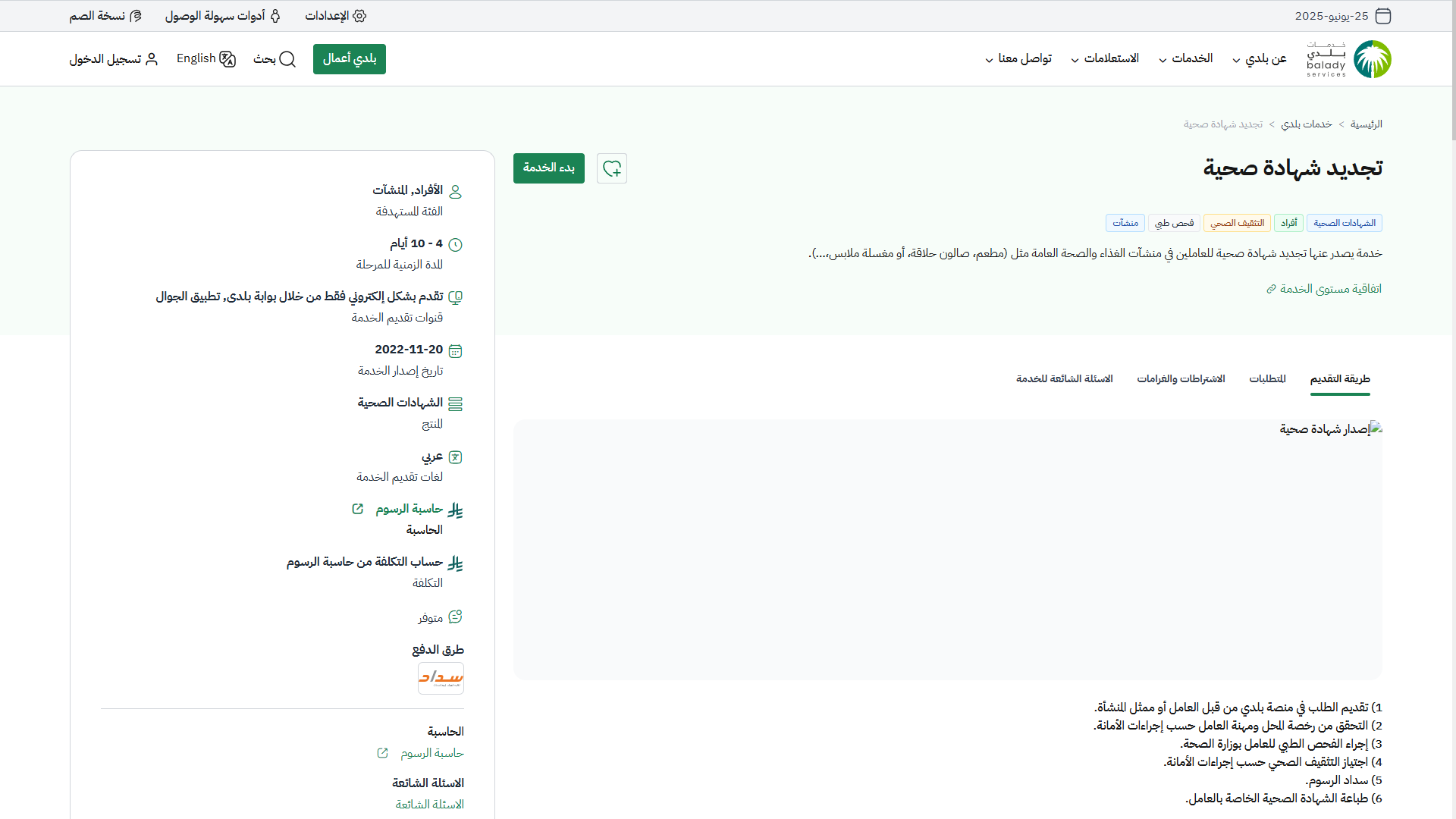 8) بعدها تظهر الشاشة التالية، والتي تمثل شاشة التعريف بالخدمة، حيث يمكن للمستخدم معرفة أحد متطلبات الخدمة من خلال القوائم (طريقة التقديم، المتطلبات، الاشتراطات والغرامات .. إلخ).