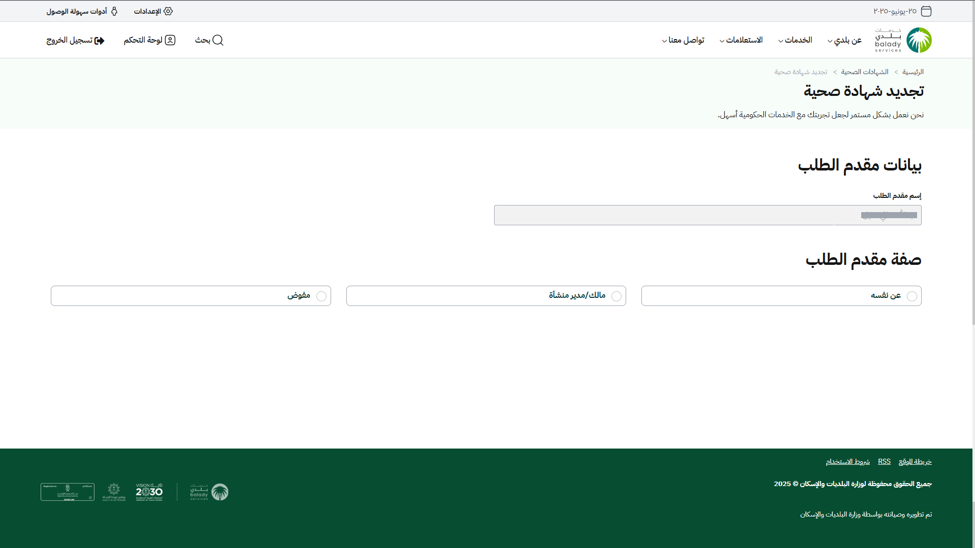 9) وبعدها يقوم المستخدم باختيار صفة مقدم الطلب من الخيارات التالية (عن نفسه، مالك/مدير منشأة، مفوض).
