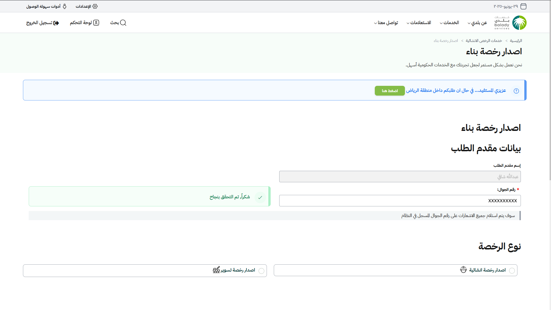 ويجب أولًا التحقق من رقم جوال مقدم الطلب، من خلال إدخال قيمة الحقل (رقم الجوال) ثم الضغط على الزر (تحقق).