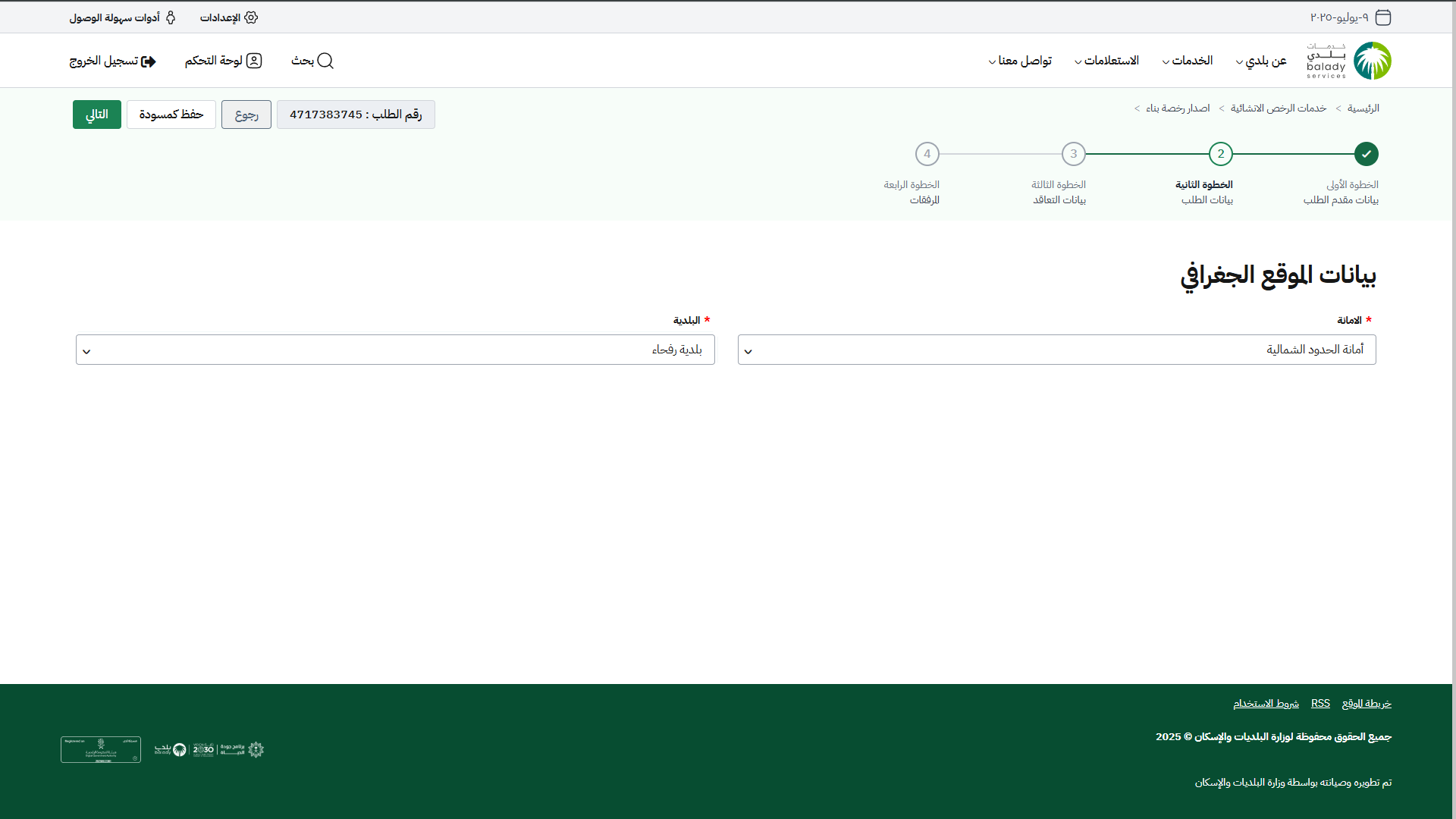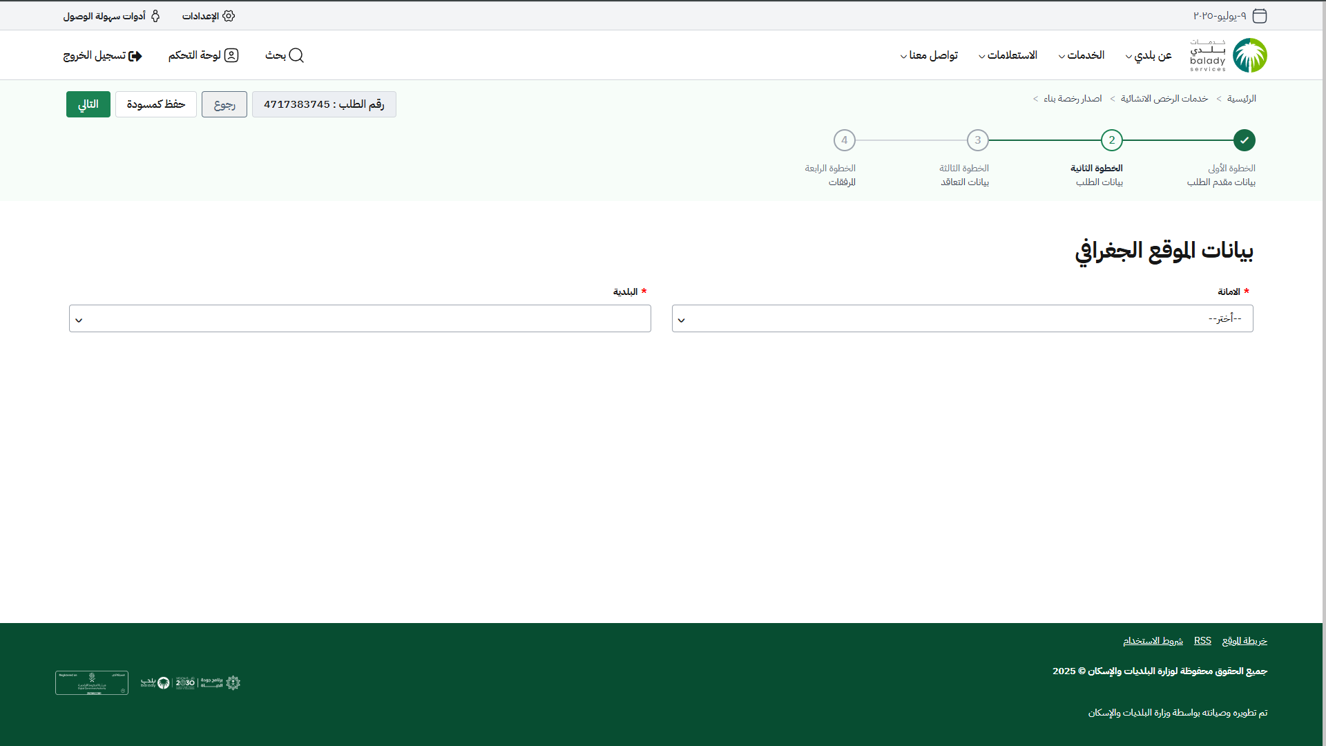1) بعد الضغط على (إصدار القرار المساحي من خلال المكتب الهندسي) يتم نقل المستفيد لمرحلة (بيانات الطلب) كما في الشكل أدناه، ليتم اختيار الموقع الجغرافي من القوائم المنسدلة التالية (الأمانة، البلدية).