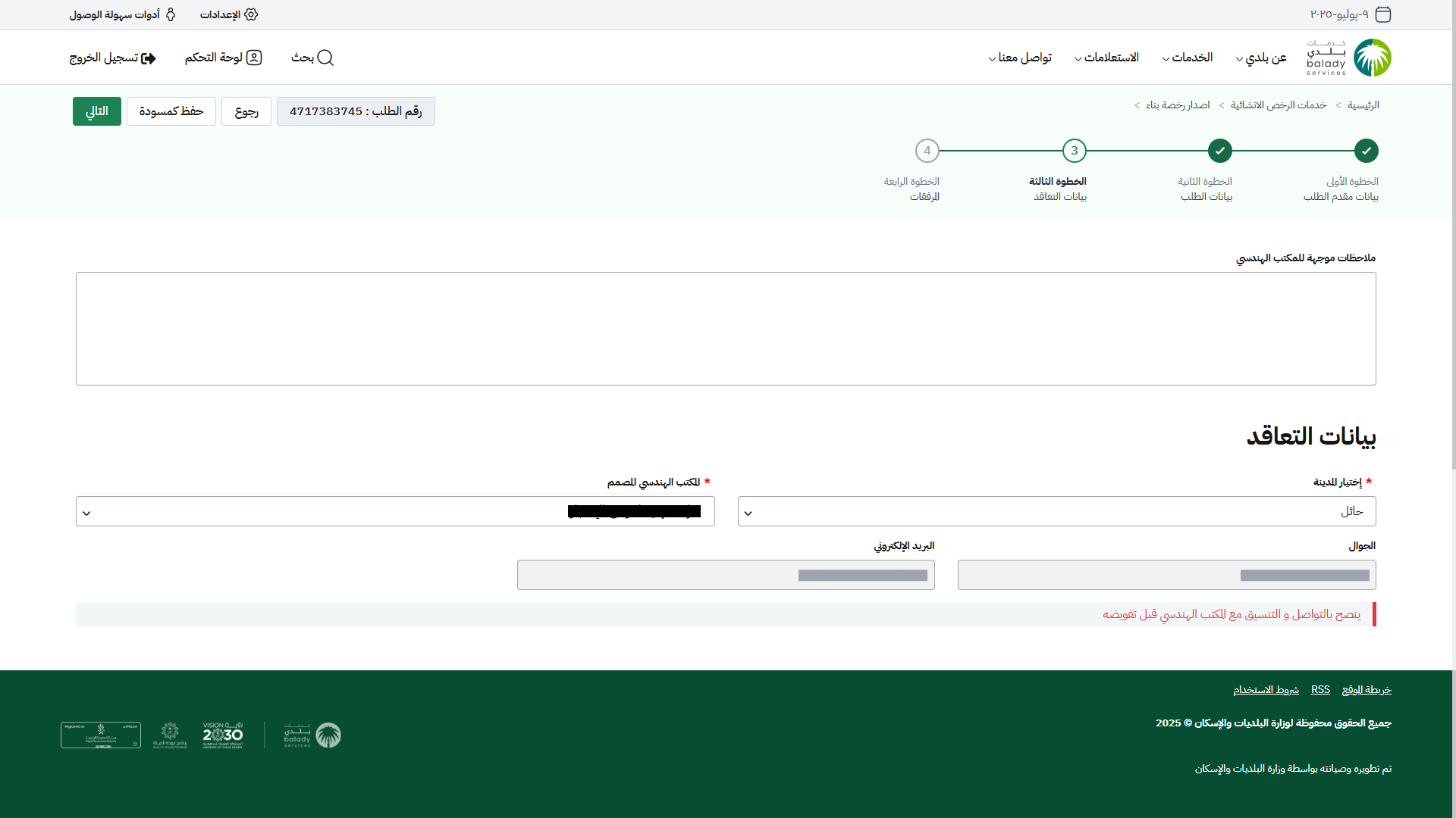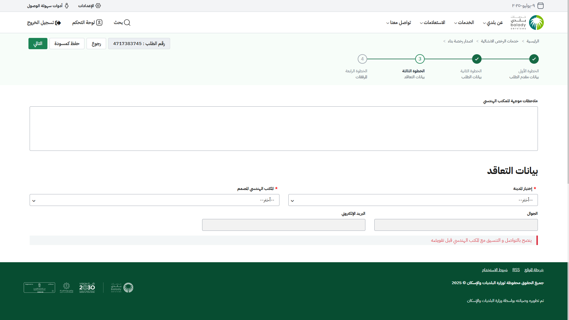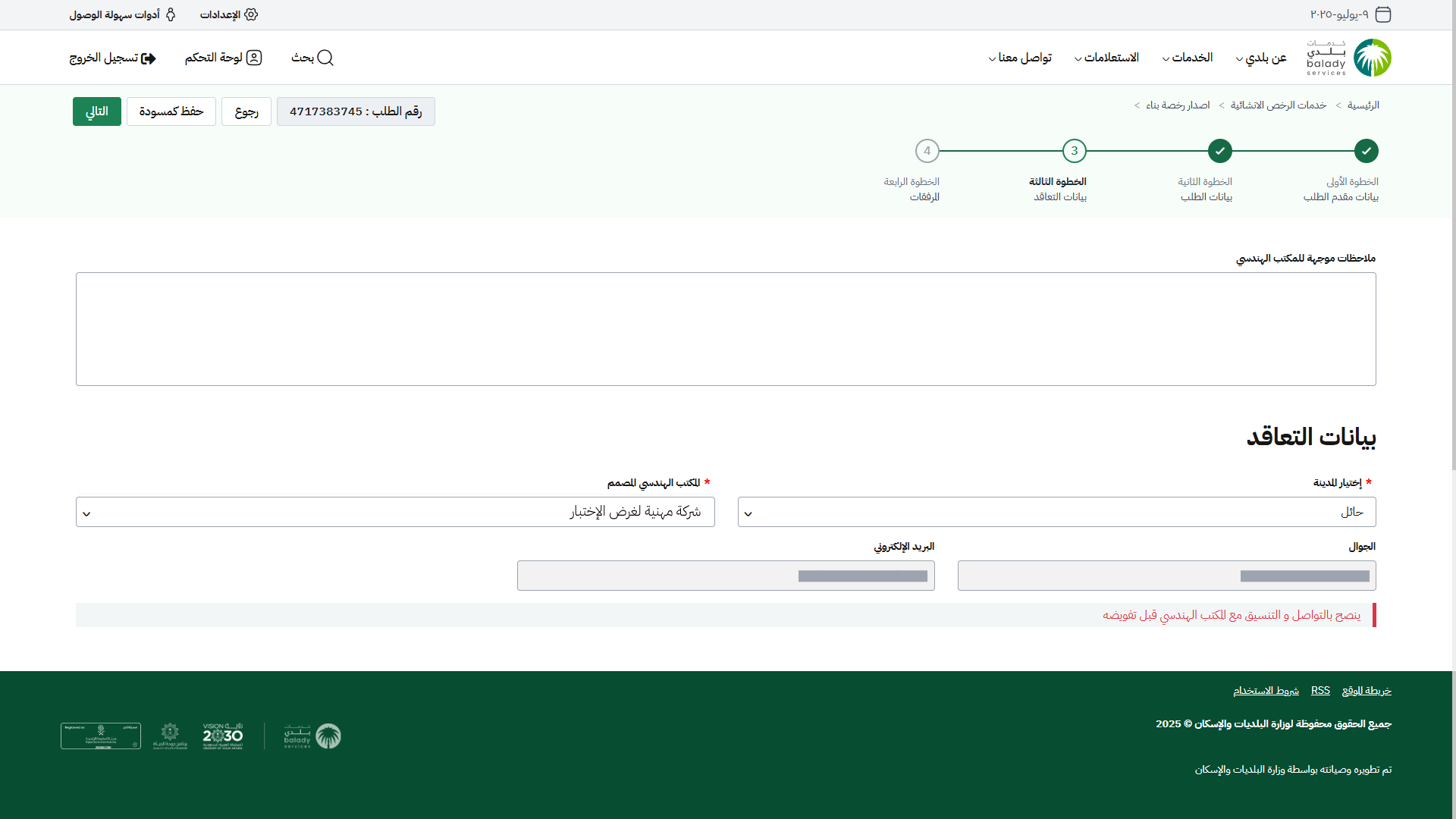 3) يتم نقل المستفيد لمرحلة (بيانات التعاقد)، ليتم إدخال قيمة الحقل (ملاحظات موجهة للمكتب الهندسي) ثم اختيار بيانات التعاقد من القوائم المنسدلة (اختيار المدينة، المكتب الهندسي المصمم).