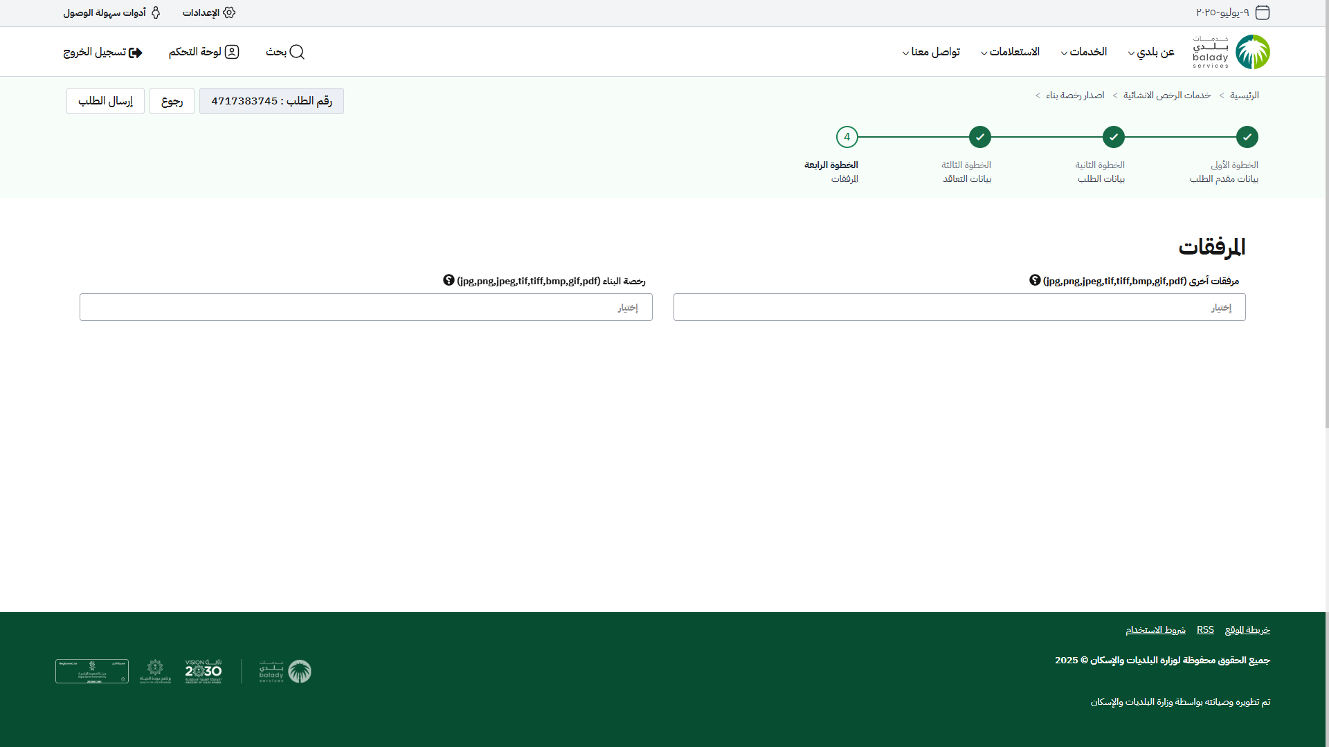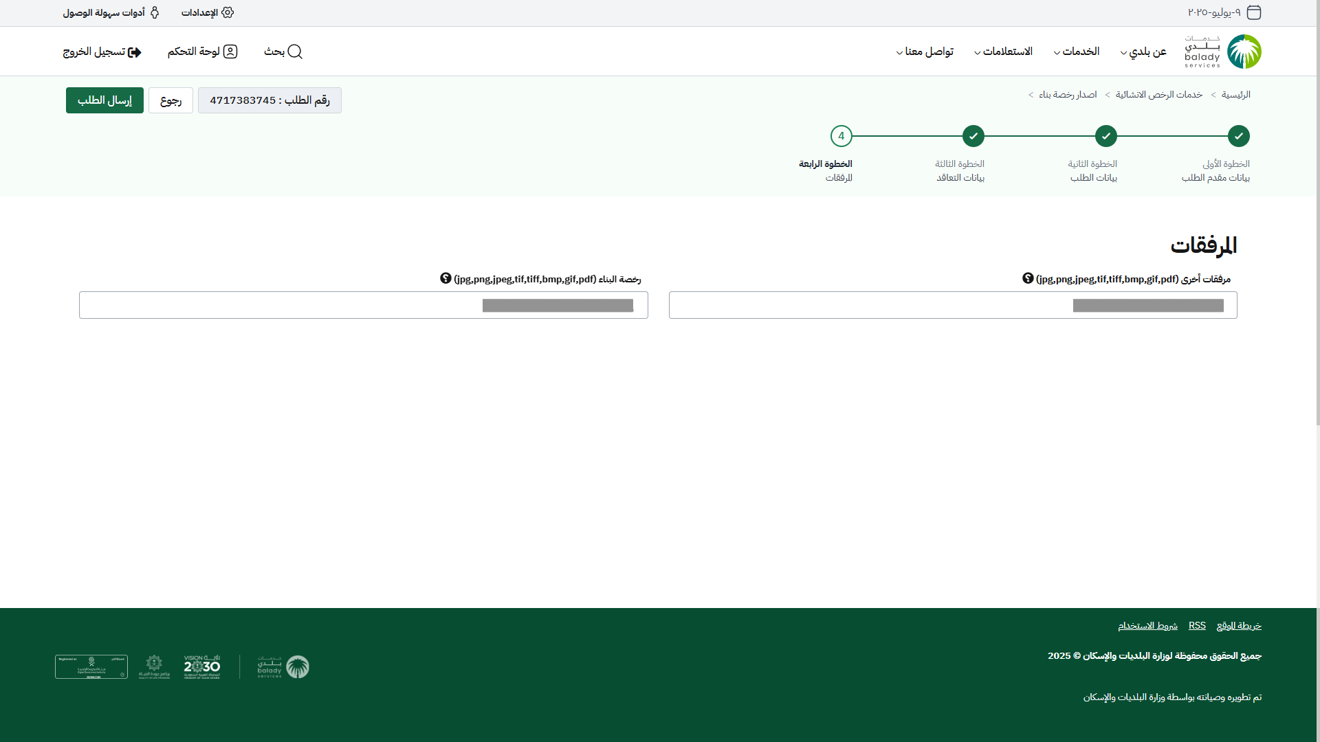 9) بعد تحديد المرفقات، يتم الضغط على الزر (إرسال الطلب) لإرسال الطلب إلى المكتب الهندسي.