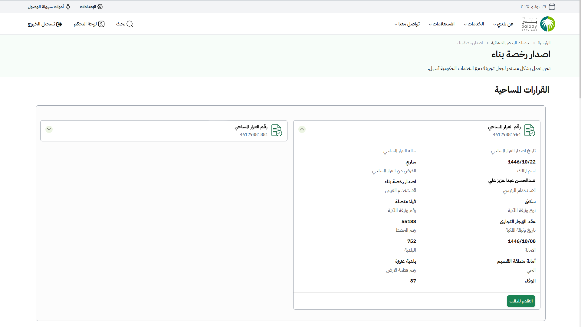 1) في المثال التالي تم تحديد القرار المساحي من القائمة، ثم يتم الضغط على الزر (التقدم للطلب) كما في الشكل أدناه.