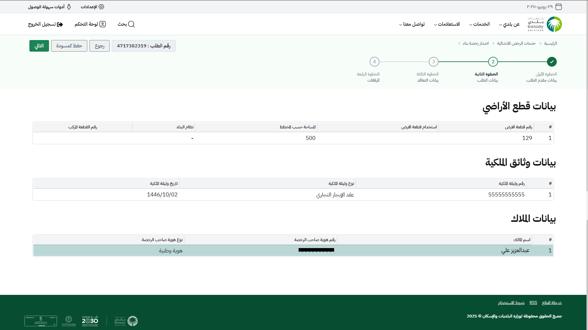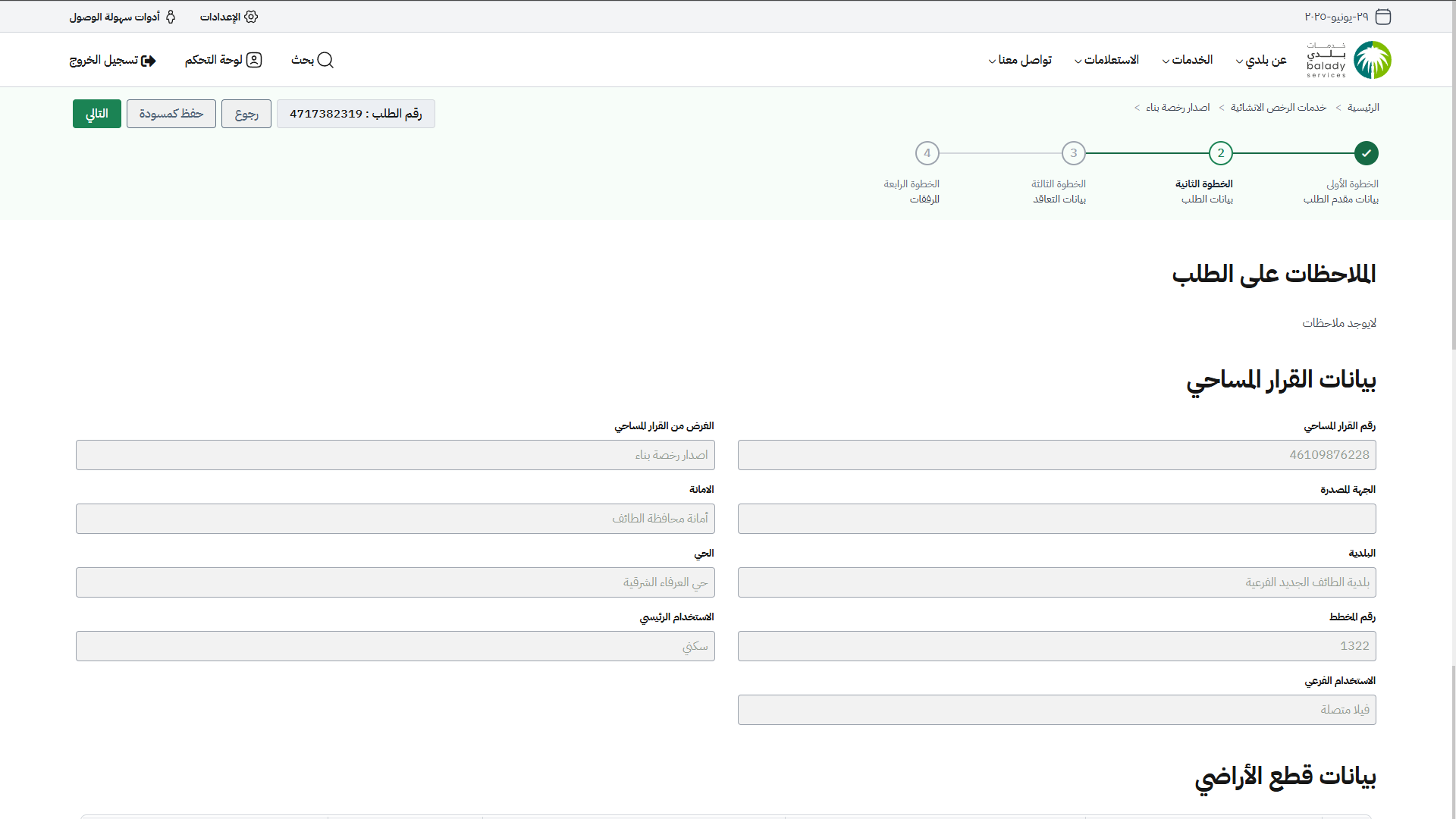 4) في حال اختيار (المسار الاعتيادي)، يتم نقل المستفيد لمرحلة (بيانات الطلب)، والتي يعرض فيها النظام الملاحظات على الطلب، وبيانات القرار المساحي وبيانات قطع الأراضي وبيانات وثائق الملكية وبيانات الملاك.