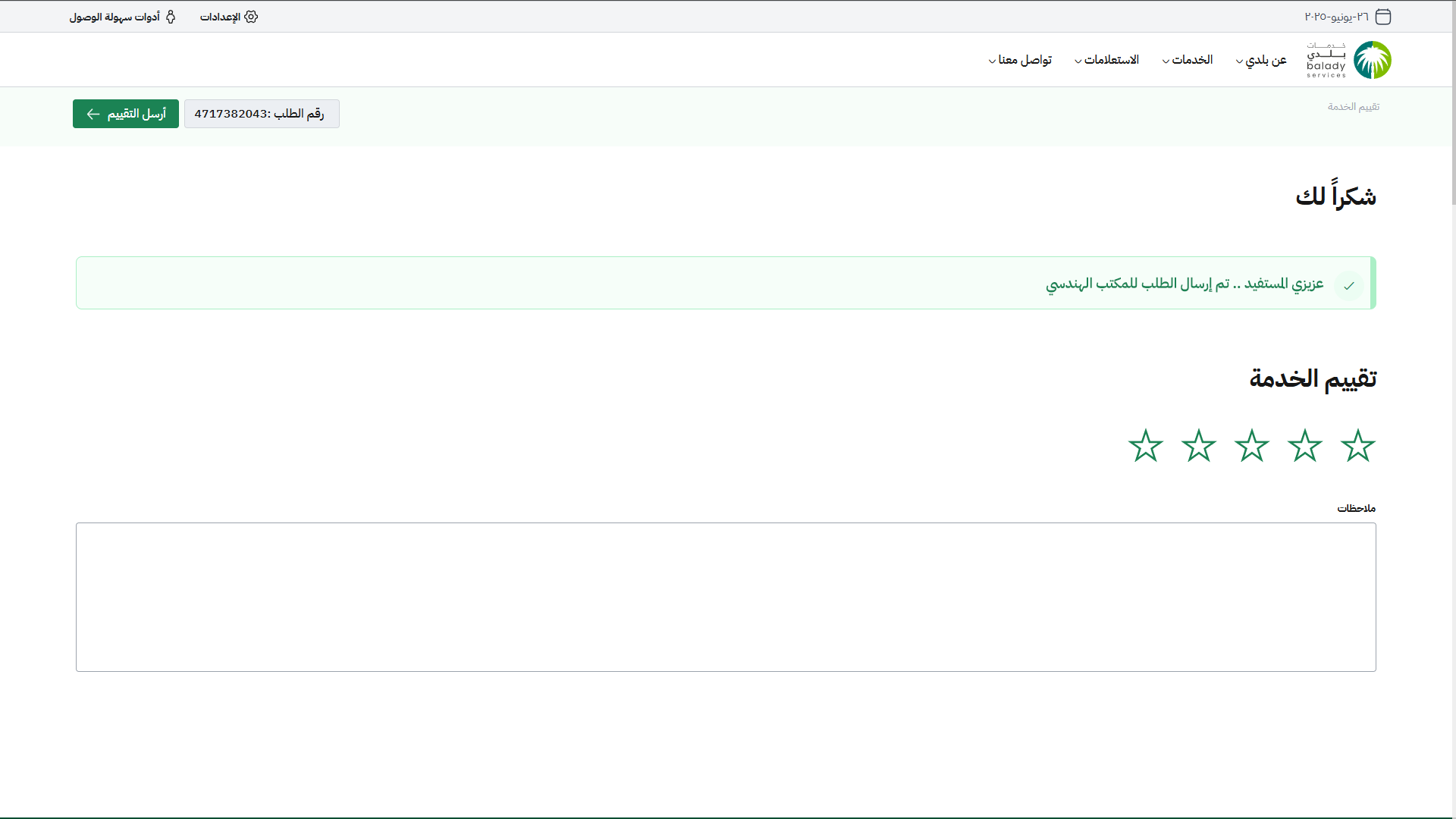 7) يتم إرسال الطلب إلى المكتب الهندسي مع إظهار رسالة تفيد بذلك، ويمكن تقييم الخدمة من خلال اختيار عدد النجوم، وإدخال قيمة الحقل (ملاحظات).