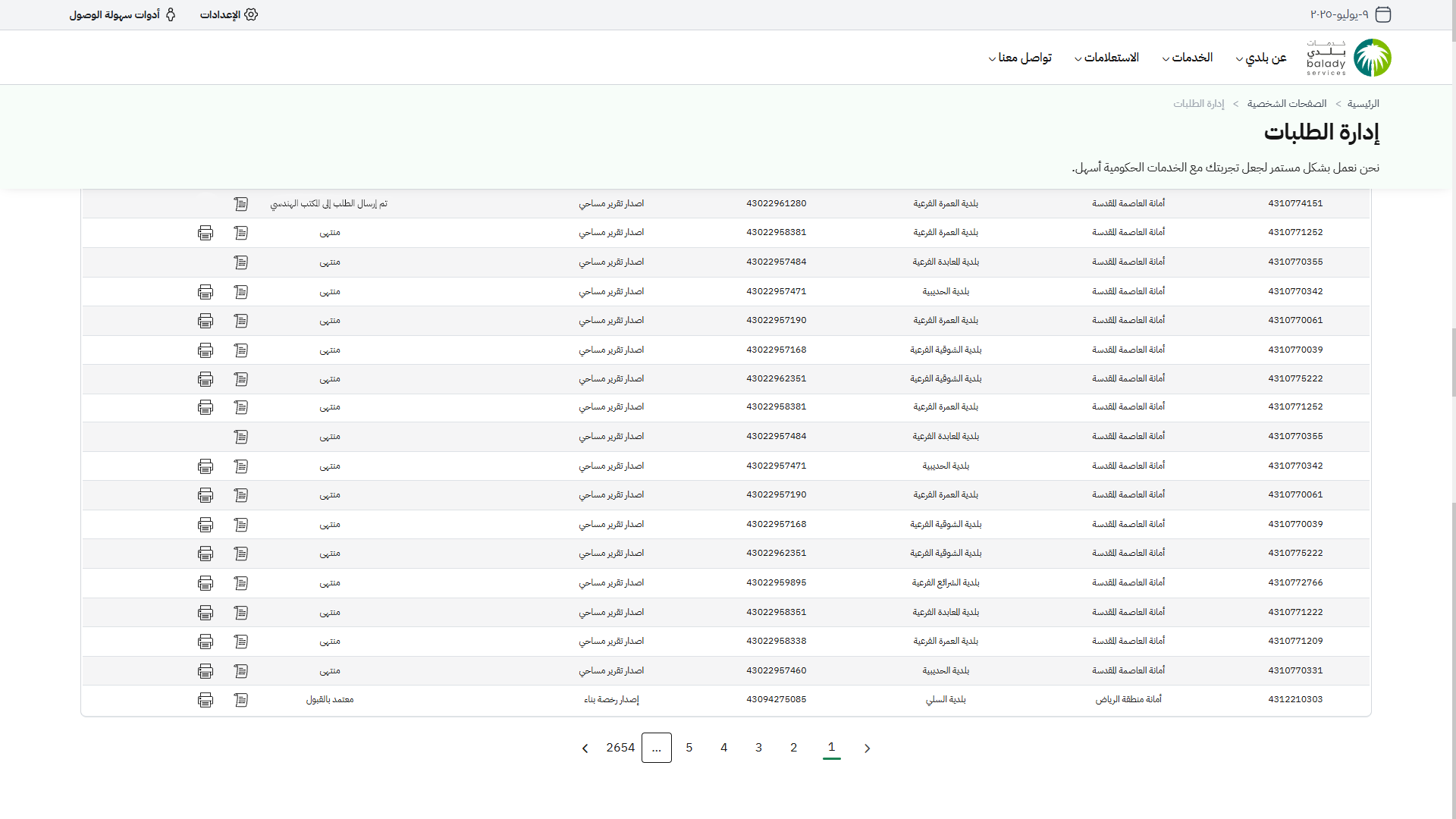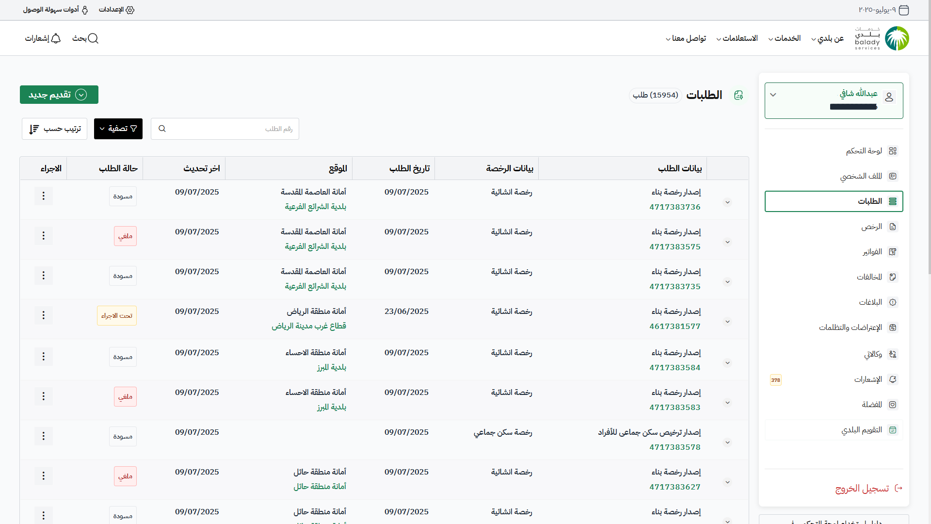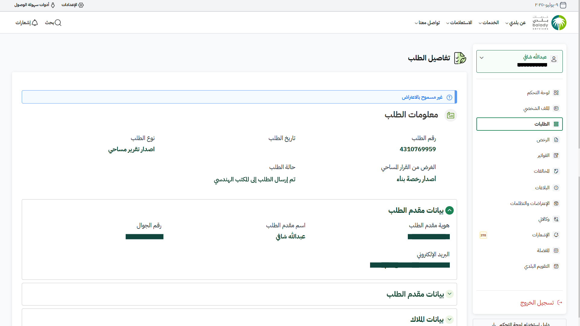 11) يمكن للمستفيد متابعة حالة الطلب من لوحة التحكم (الطلبات)، وتكون حالته (تم إرسال الطلب إلى المكتب الهندسي).