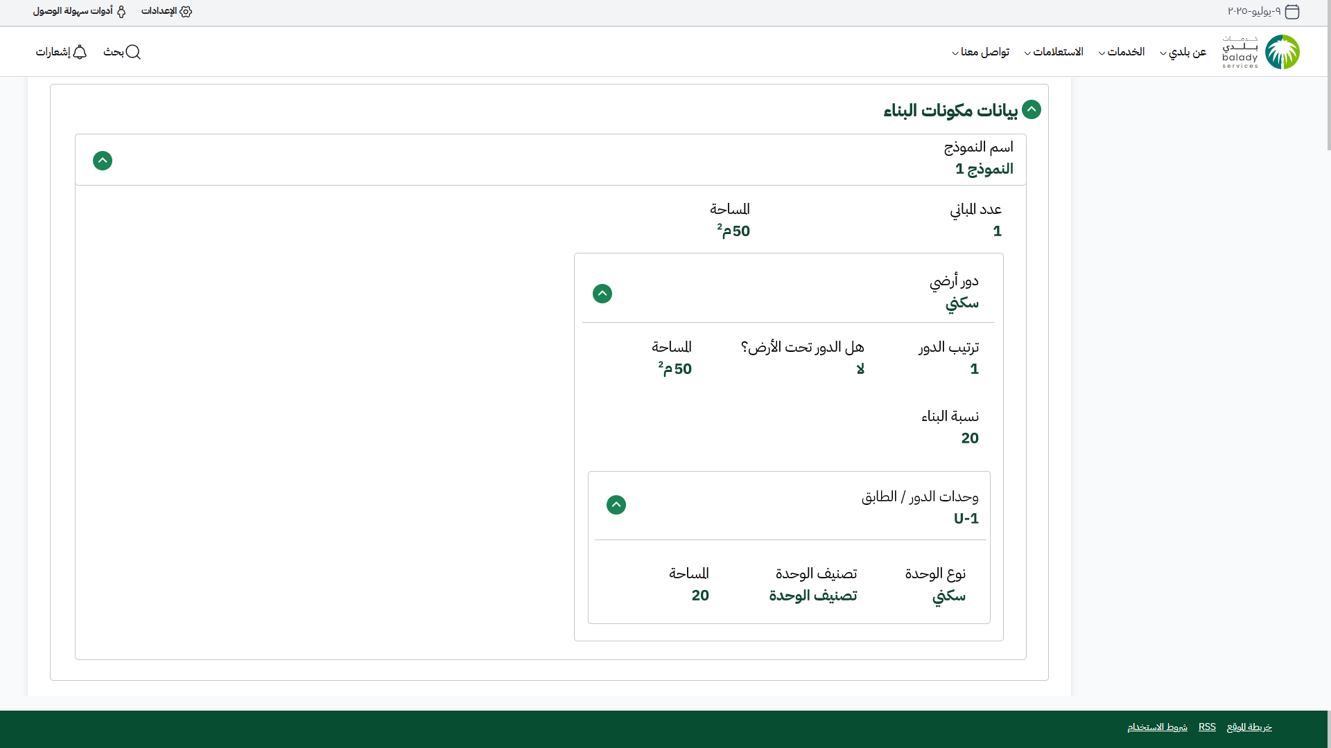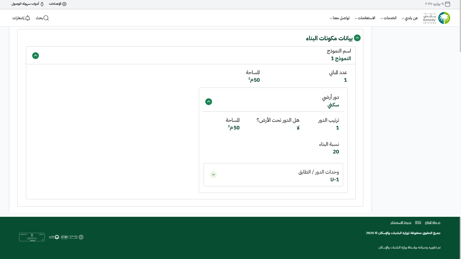 16) بالضغط على رمز السهم بجانب اسم المكون، يتم عرض تفاصيل المكون (ترتيب الدور / هل الدور تحت الأرض / المساحة / نسبة البناء)، بالإضافة إلى وحدات الدور / الطابق).
