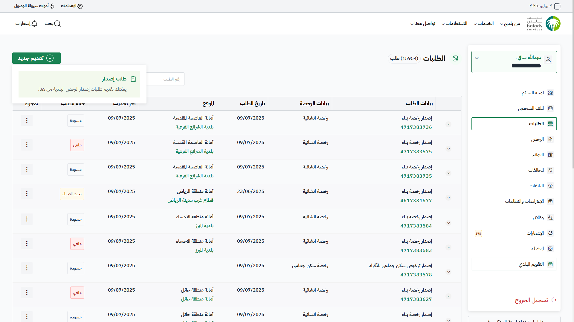 8) يمكن للمستفيد متابعة حالة الطلب من لوحة التحكم (الطلبات)، وتكون حالته (تم إرسال الطلب إلى المكتب الهندسي).