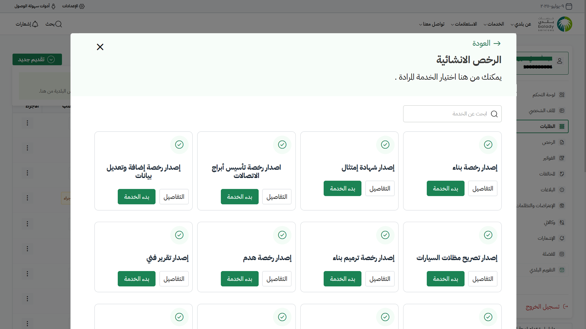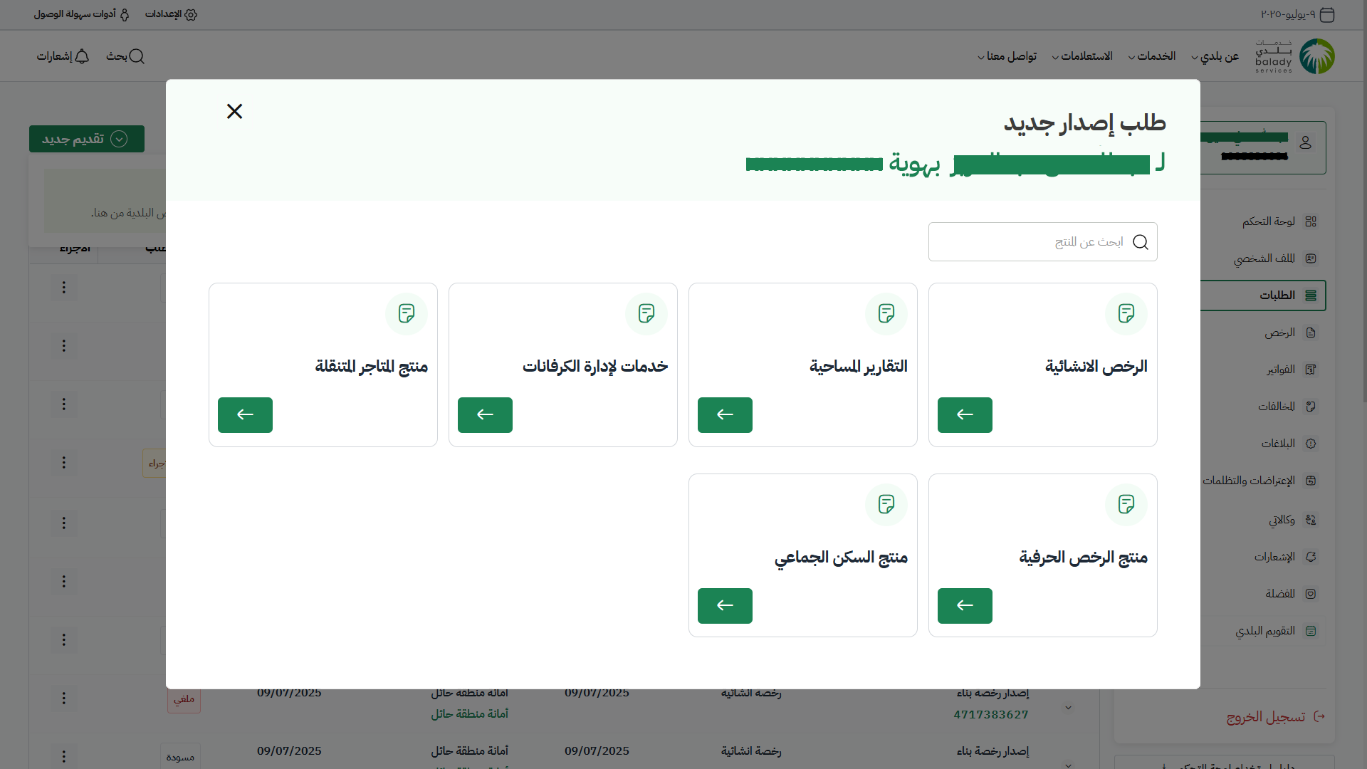 9) تظهر خدمات منتج الرخص الإنشائية، حيث يتم اختيار خدمة (إصدار رخصة بناء).