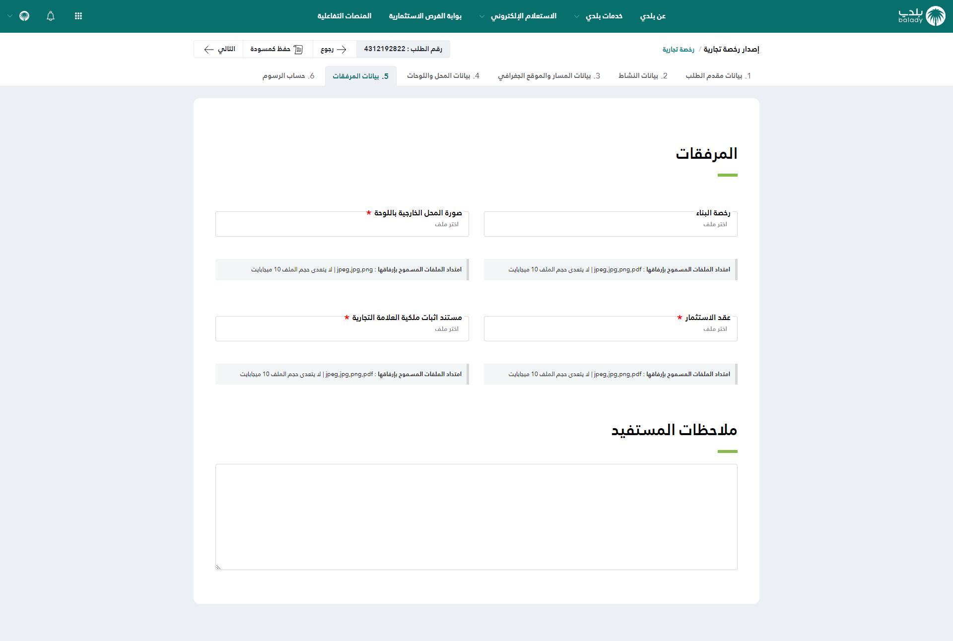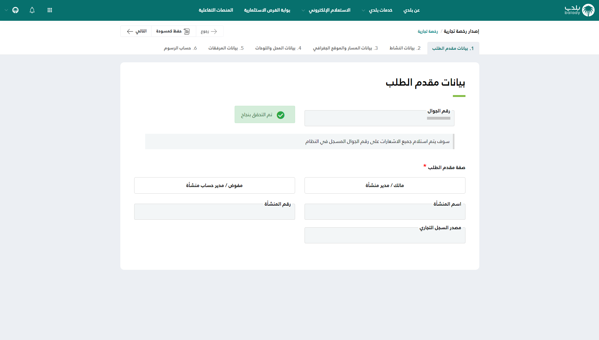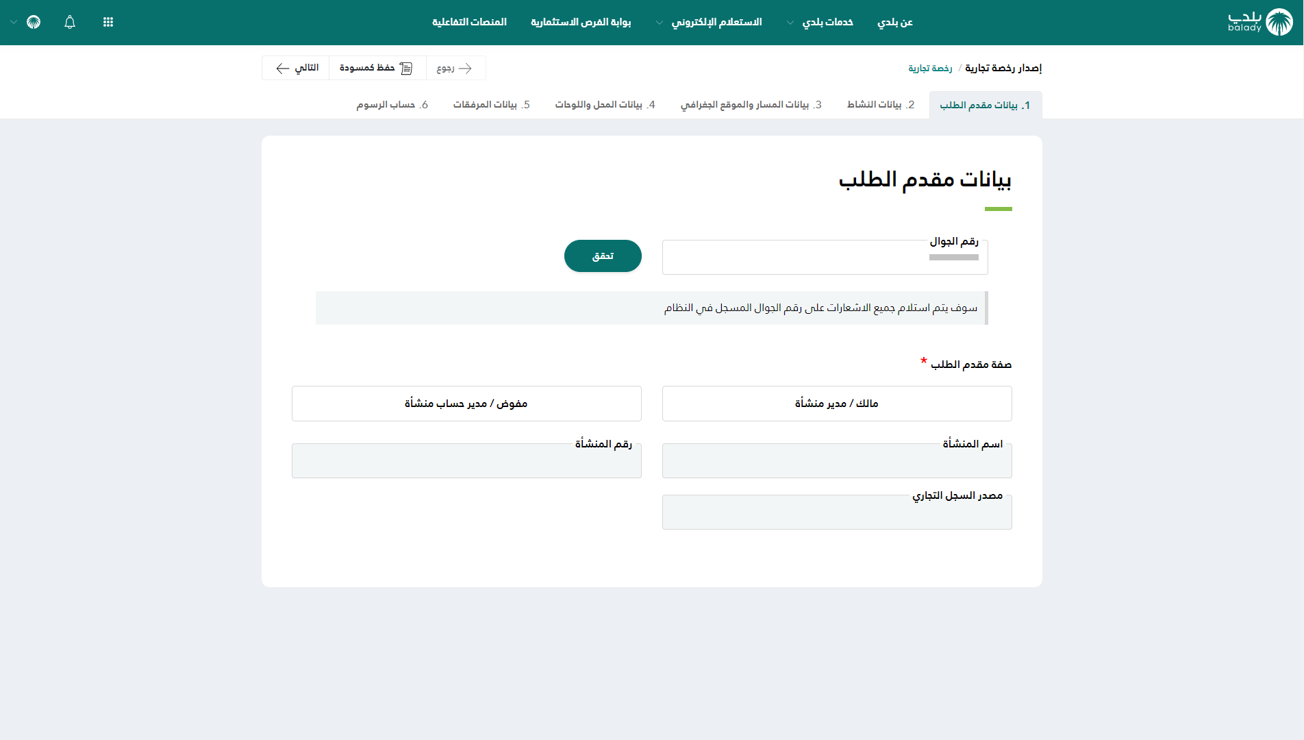 وبعد الانتهاء من تعبئة البيانات؛ يتم الضغط على الزر (التالي) للانتقال إلى المرحلة الخامسة، مع إمكانية حفظ الطلب كمسودة للرجوع إليه لاحقًــا، وذلك من خلال الزر (حفظ كمسودة)، وإمكانية العودة للمرحلة السابقة من خلال الزر (رجوع).