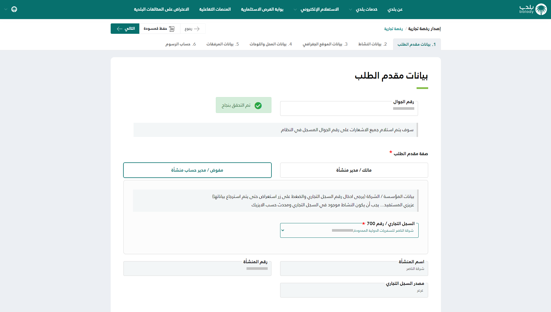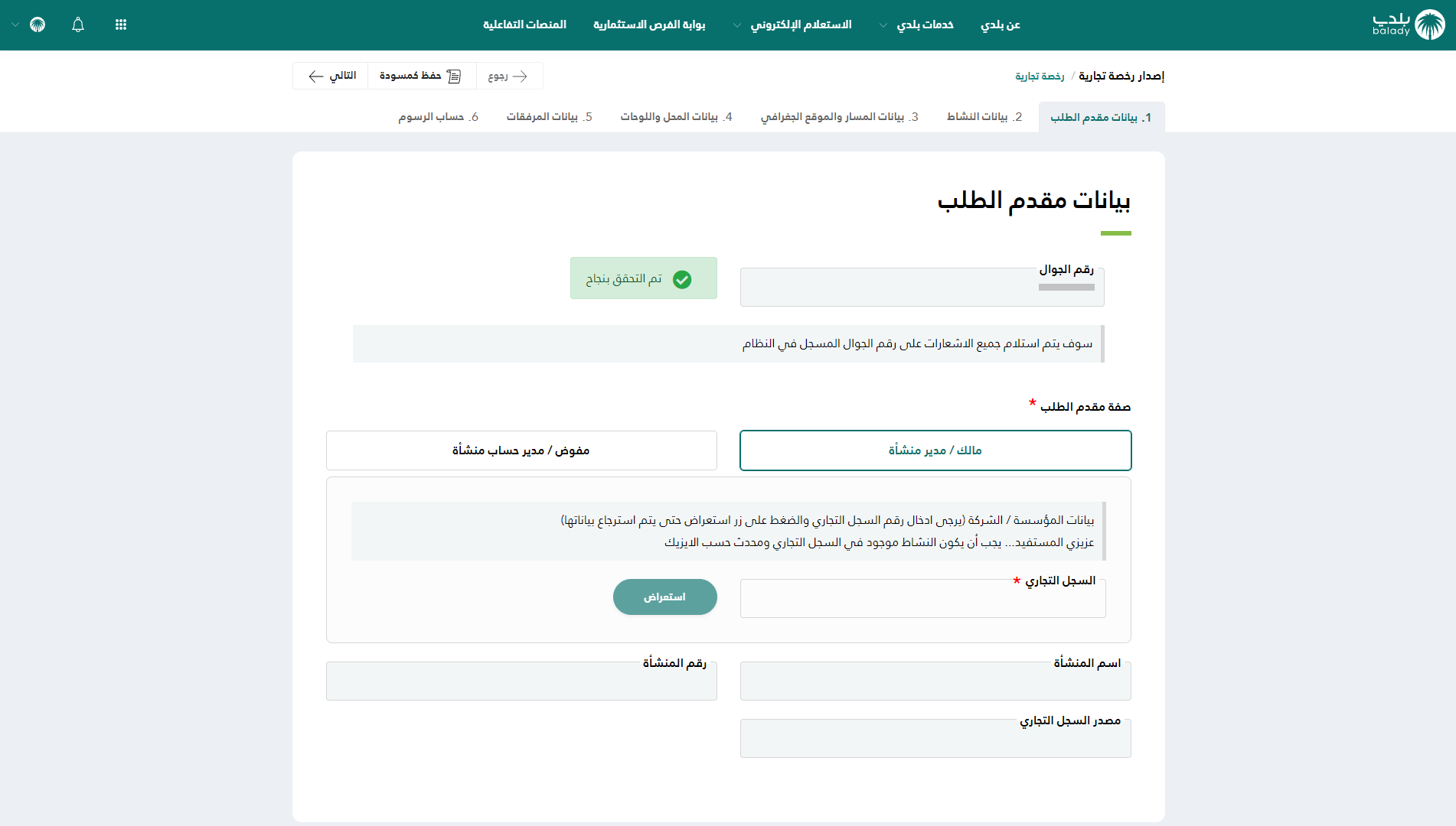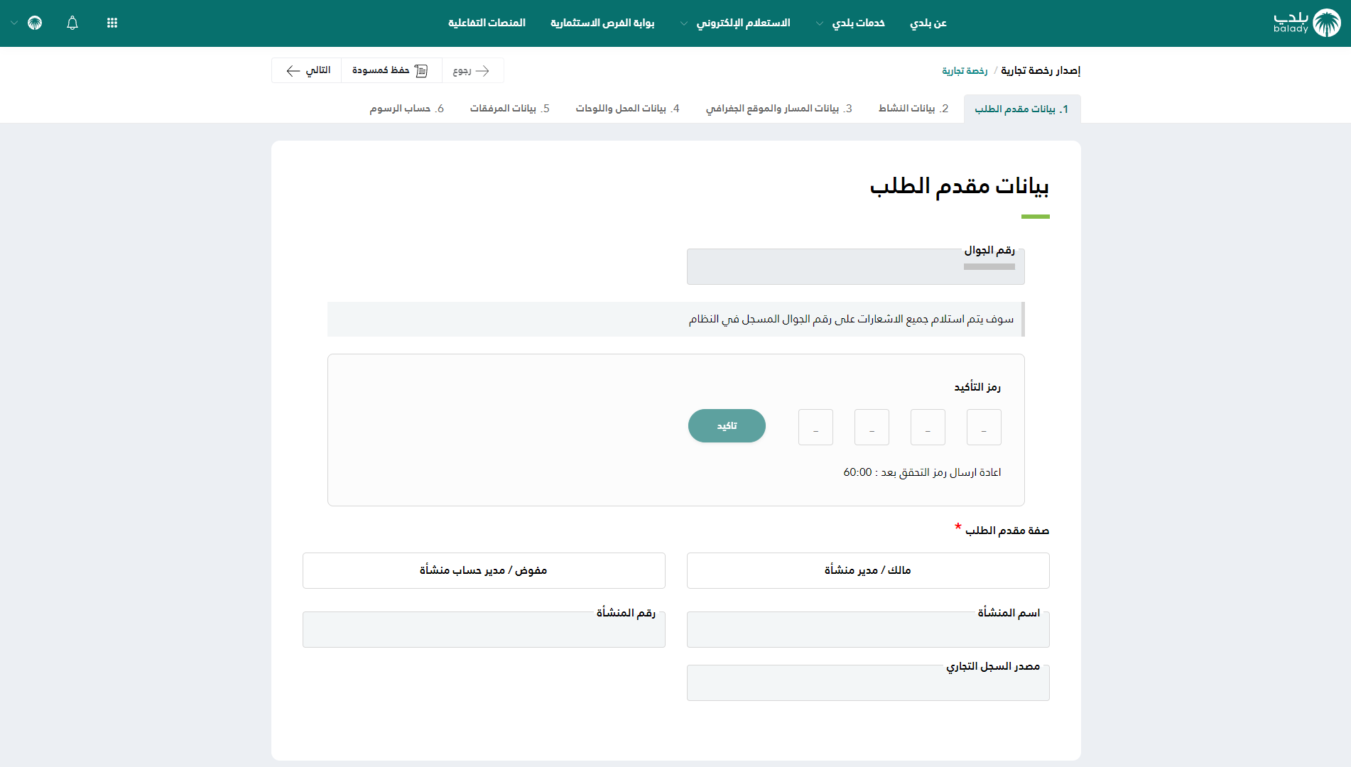 وبعد الانتهاء من تعبئة البيانات؛ يتم الضغط على الزر (التالي) للانتقال إلى المرحلة الخامسة، مع إمكانية حفظ الطلب كمسودة للرجوع إليه لاحقًــا، وذلك من خلال الزر (حفظ كمسودة)، وإمكانية العودة للمرحلة السابقة من خلال الزر (رجوع).