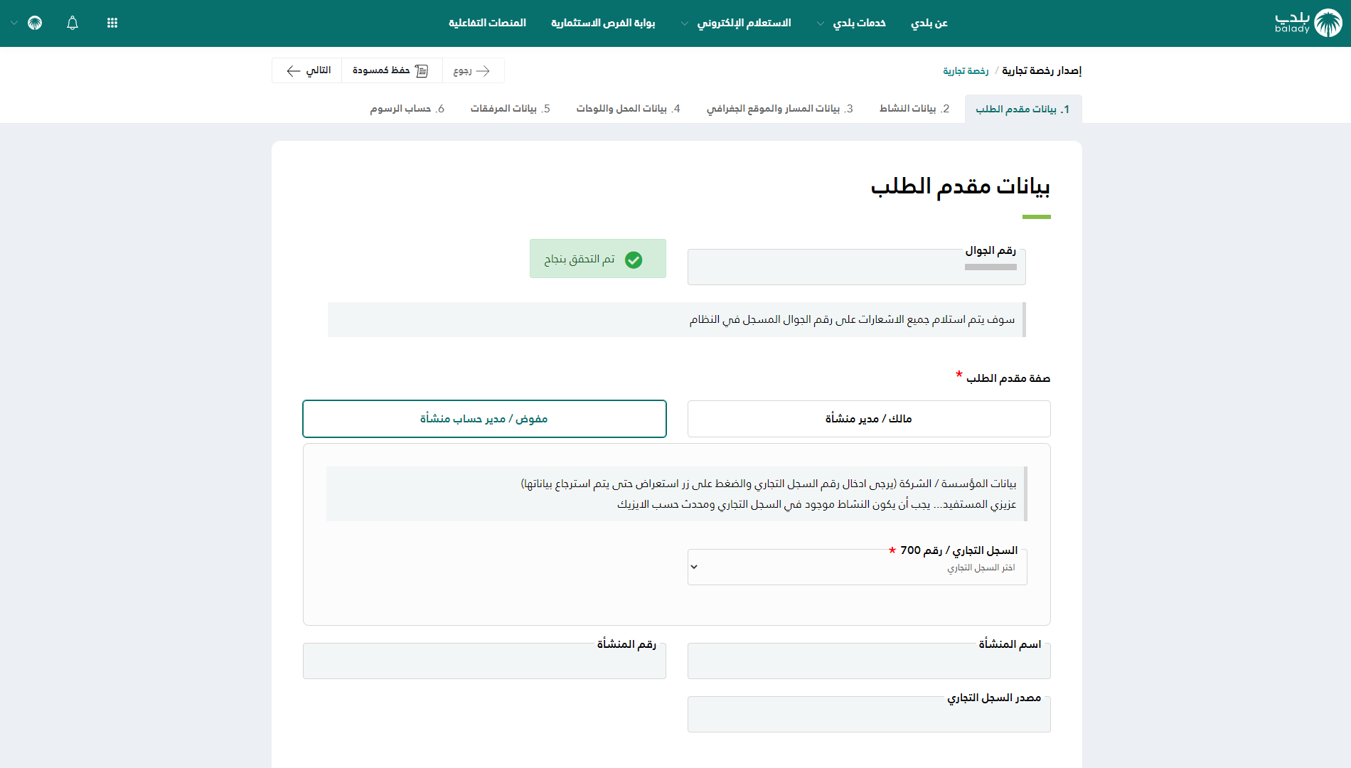 9) وبعدها تظهر للمستخدم الشاشة أدناه، والتي تمثل أول مرحلة من مراحل إصدار الرخصة وهي مرحلة (بيانات مقدم الطلب)، حيث يقوم المستخدم بإدخال رقم الجوال ثم الضغط على الزر (تحقق) ليتم التأكد من رقم جواله.