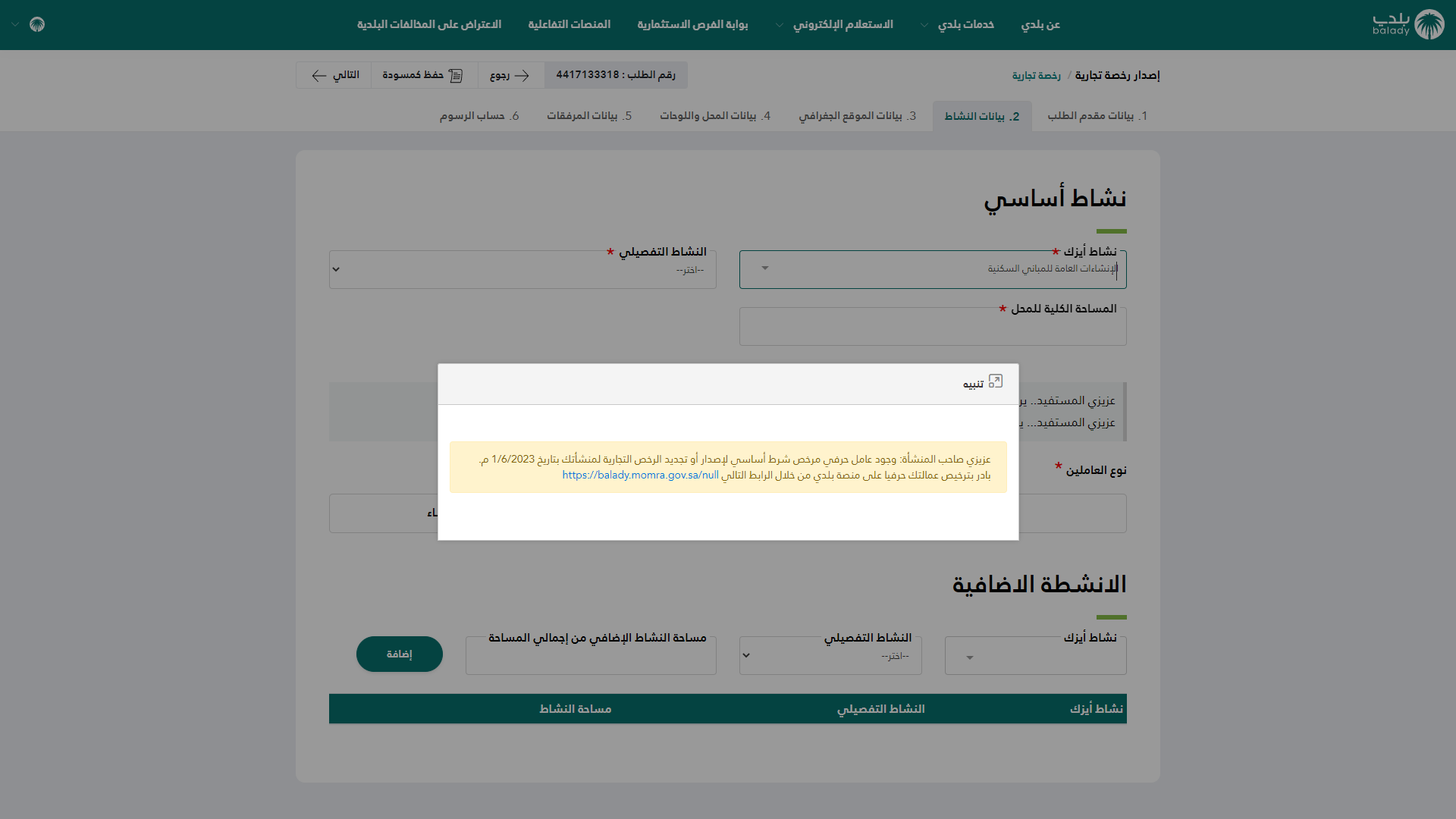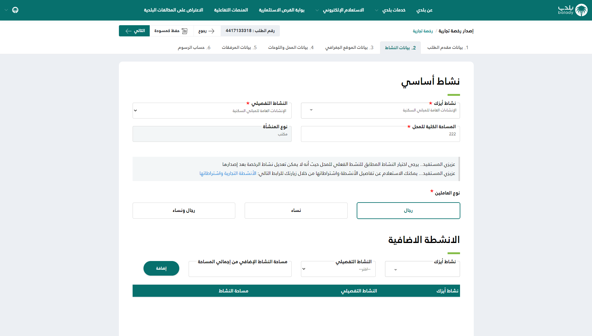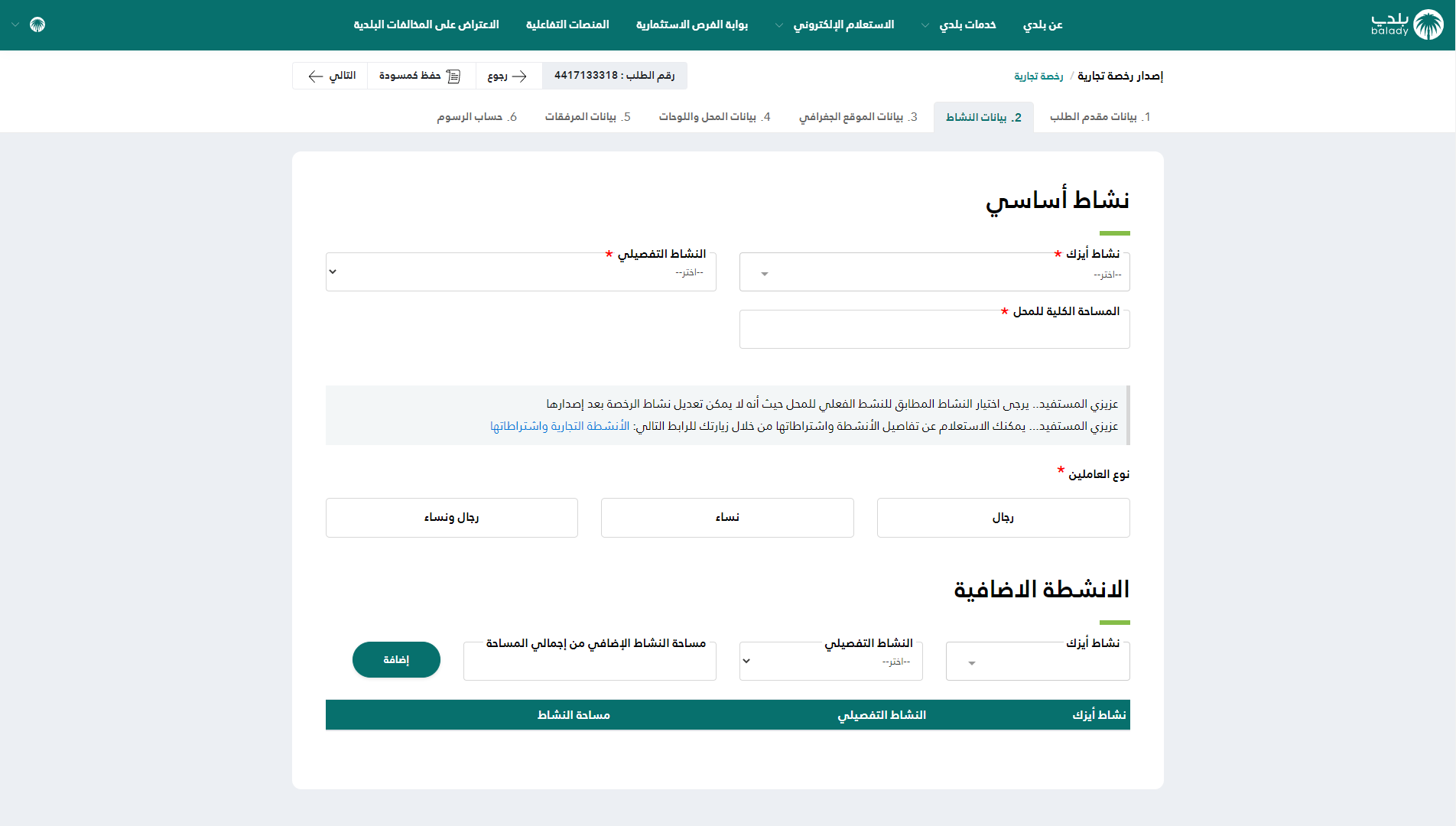 16) وبعدها يظهر الشكل أدناه، والذي يمثل مرحلة (بيانات النشاط)، حيث يقوم المستخدم بتعبئة قيم القوائم المنسدلة التالية (نشاط آيزيك، النشاط التفصيلي، المساحة الكلية للمحل) على التوالي.