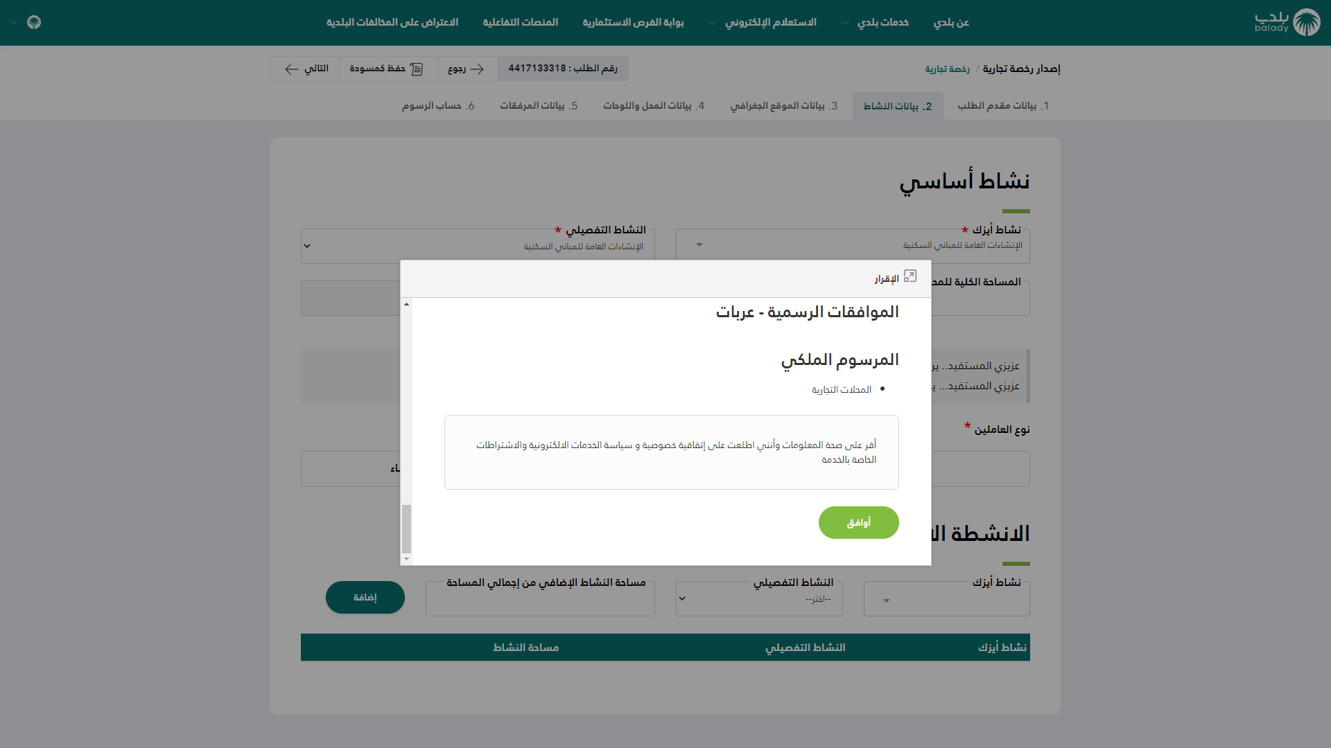 18) وبعد اختيار قيمة القائمة المنسدلة (النشاط التفصيلي) تظهر شاشة فرعية صغيرة كما في الشكل التالي، ليتم الموافقة على الإقرار، من خلال الضغط على الزر (أوافق).