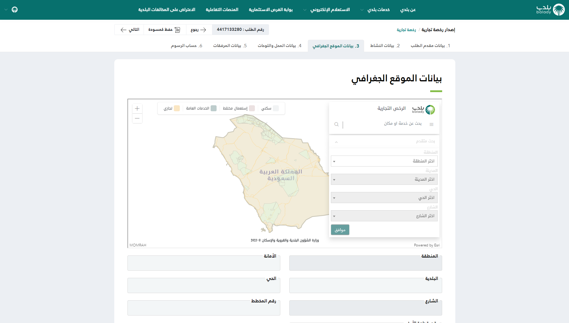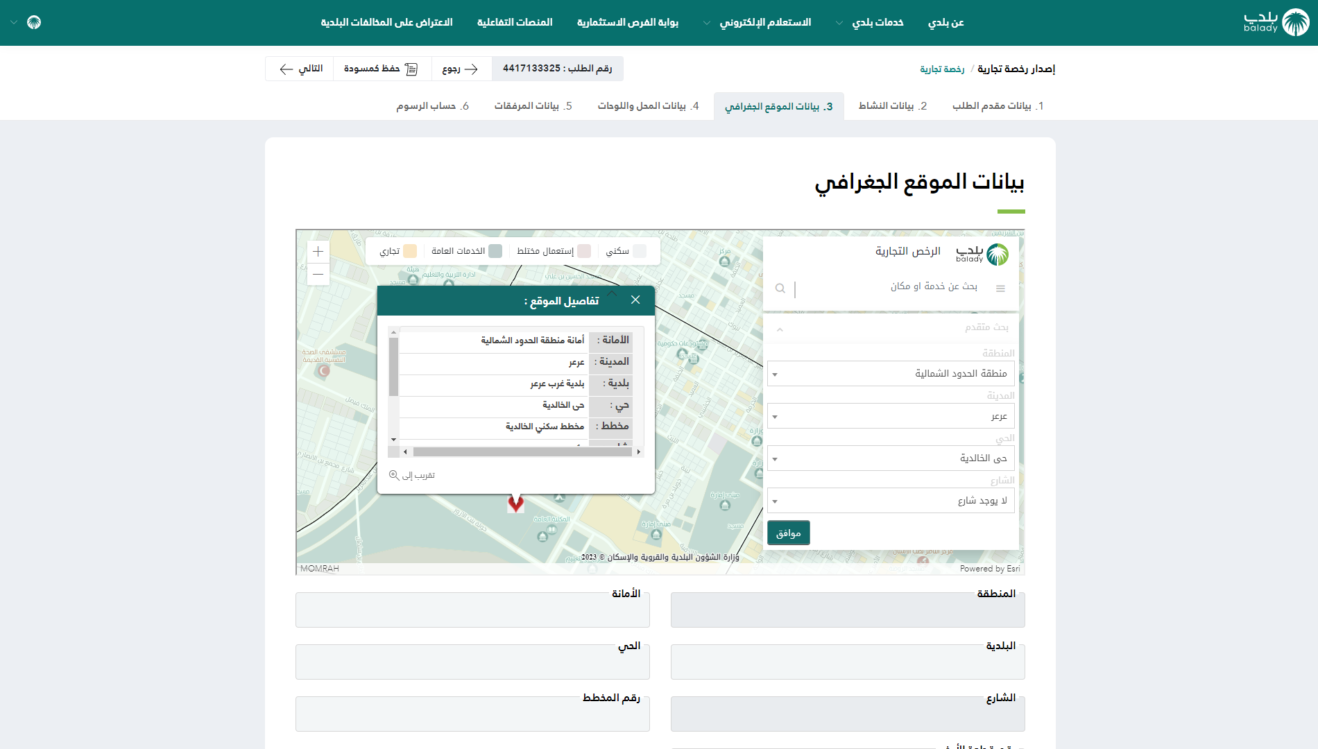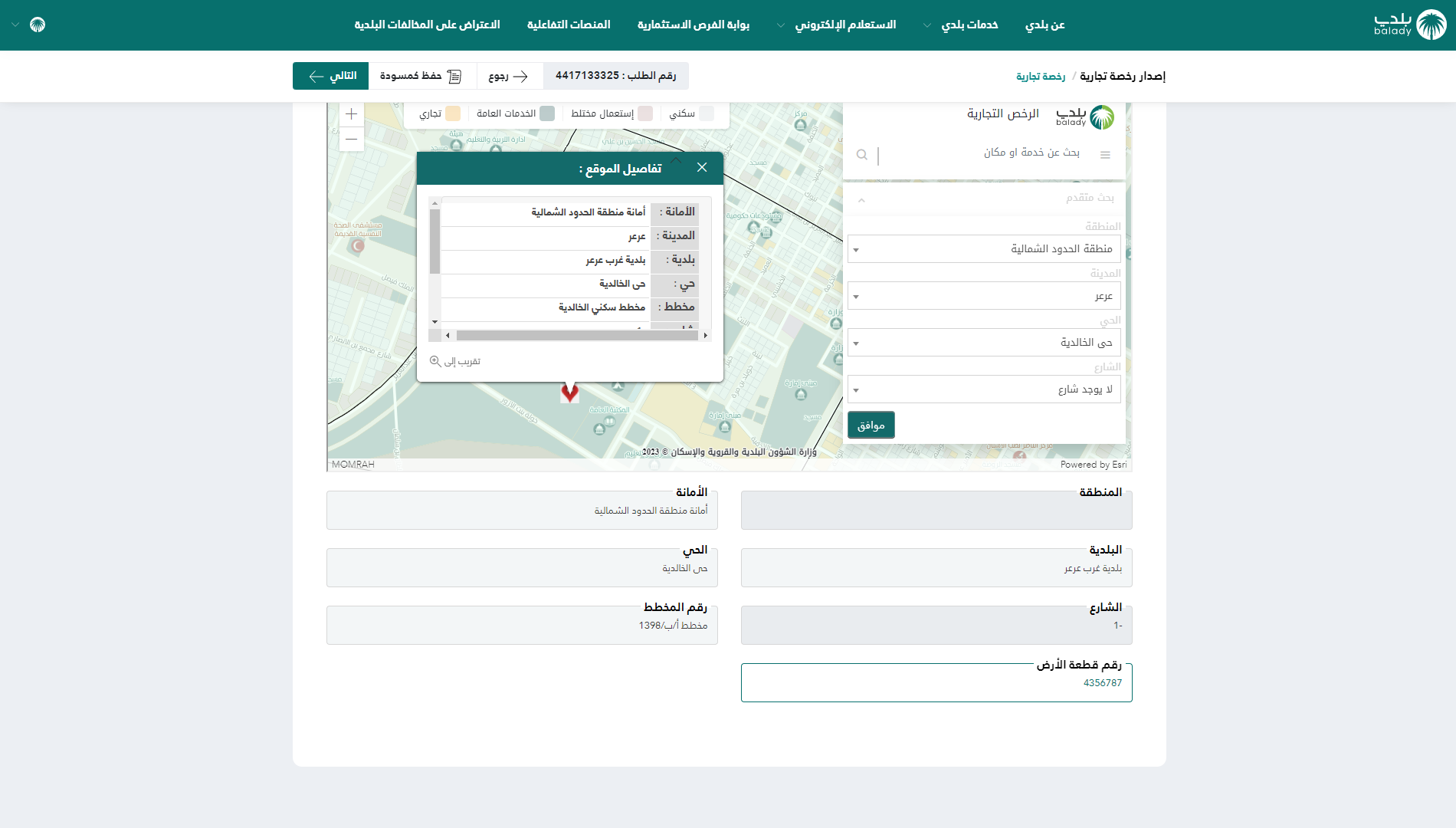 22) وبعد الضغط على الزر (موافق) يتم تعبئة الحقول التالية (المنطقة، الأمانة، البلدية، الحي، الشارع، رقم المخطط، رقم قطعة الأرض) كما في الشكل أدناه.