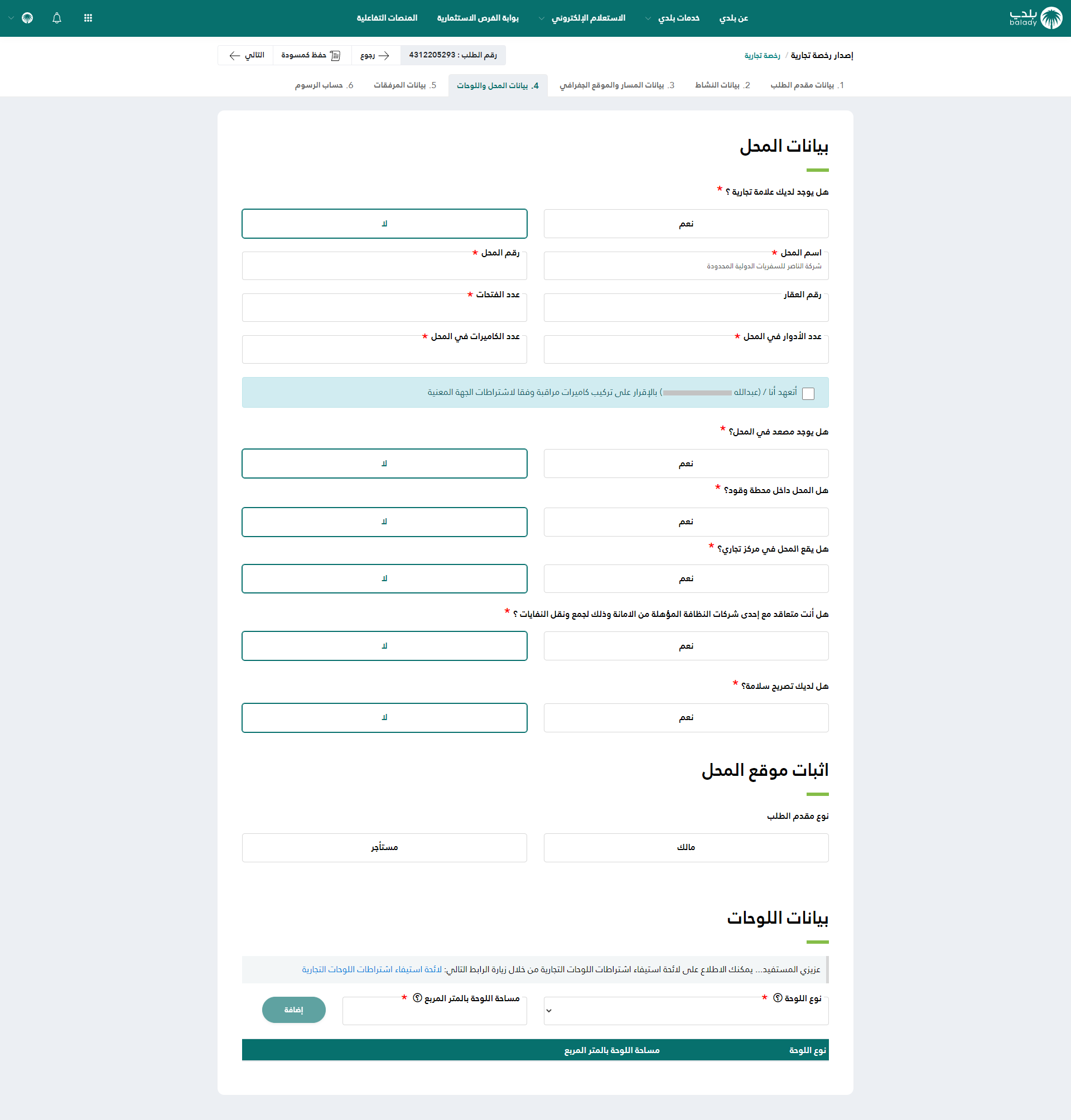 23) وبعدها تظهر مرحلة (بيانات المحل واللوحات)، حيث يقوم المستخدم بالإجابة على السؤال (هل يوجد لديك علامة تجارية ؟).