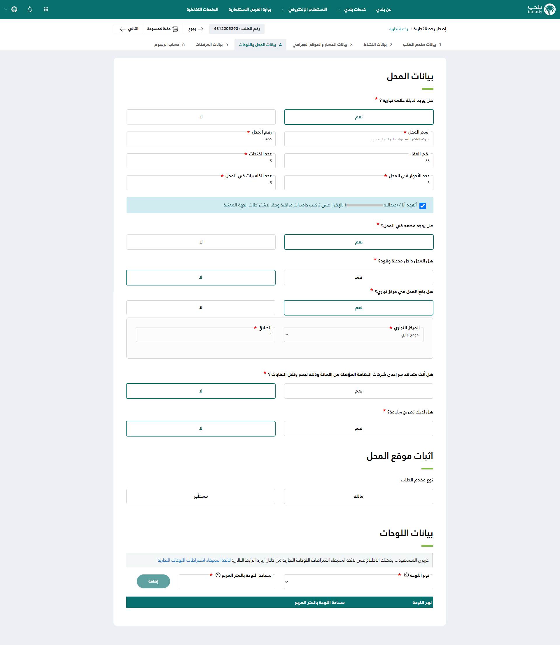 ثم يتم إدخال قيم الحقول التالية (اسم المحل، رقم المحل، رقم العقار، عدد الفتحات، عدد الأدوار في المحل، عدد الكاميرات في المحل). ثم يقوم بالموافقة على التعهد، وذلك بالضغط على مربع الاختيار.