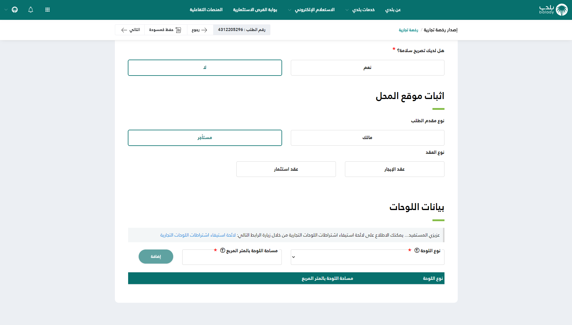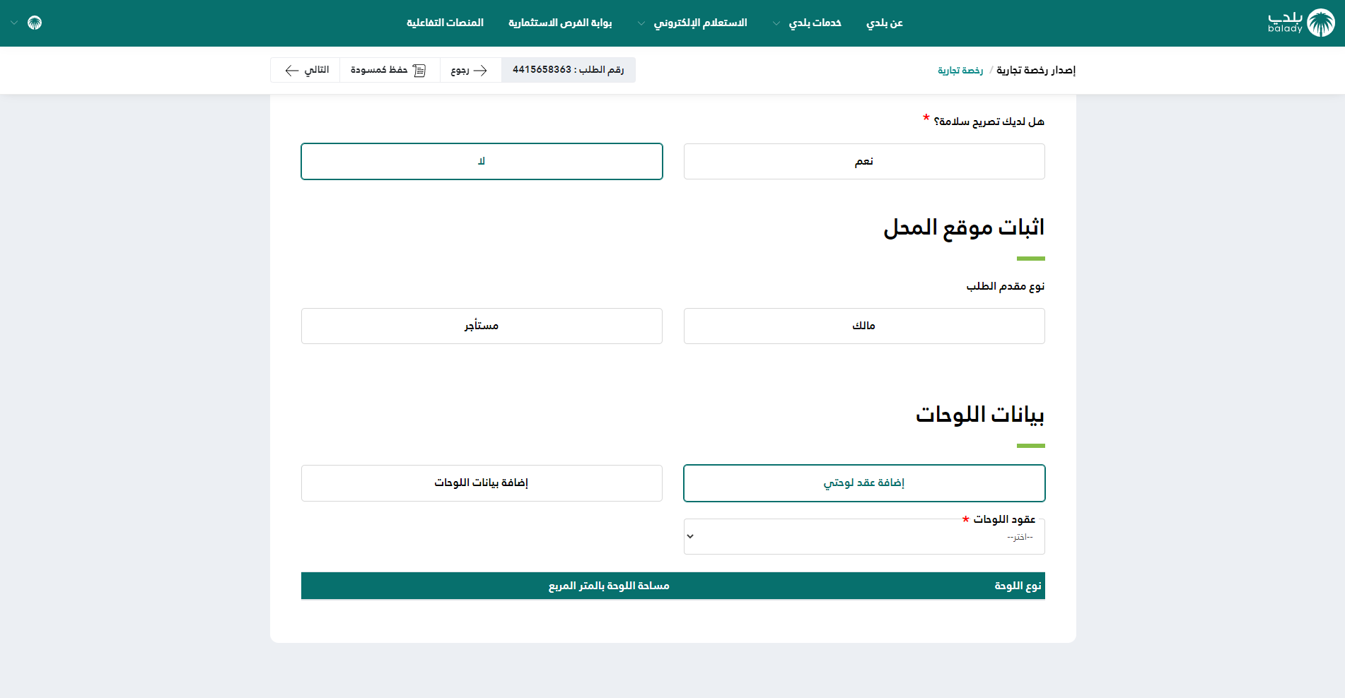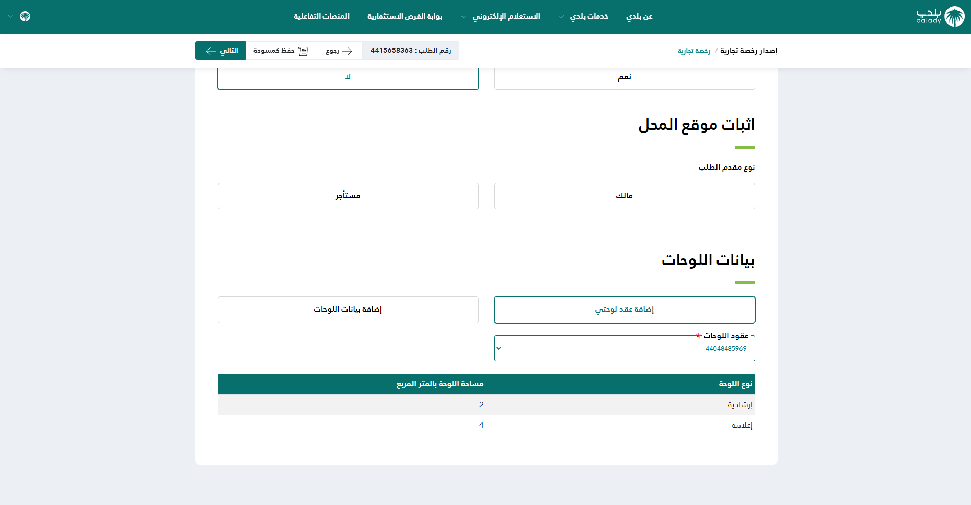 وبعدها يتم الضغط على الزر (التالي)، مع إمكانية حفظ الطلب كمسودة للرجوع إليه لاحقًــا وذلك من خلال الزر (حفظ كمسودة)، وإمكانية العودة للمرحلة السابقة من خلال الزر (رجوع).