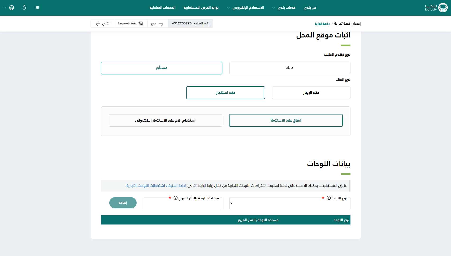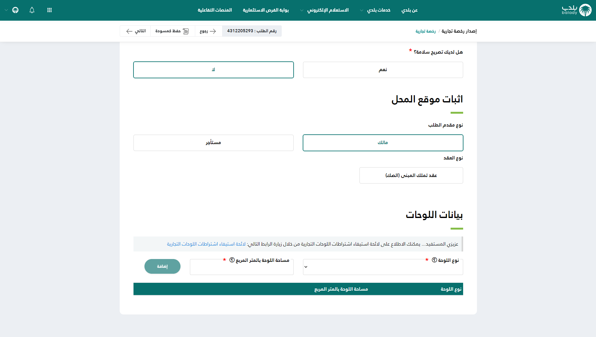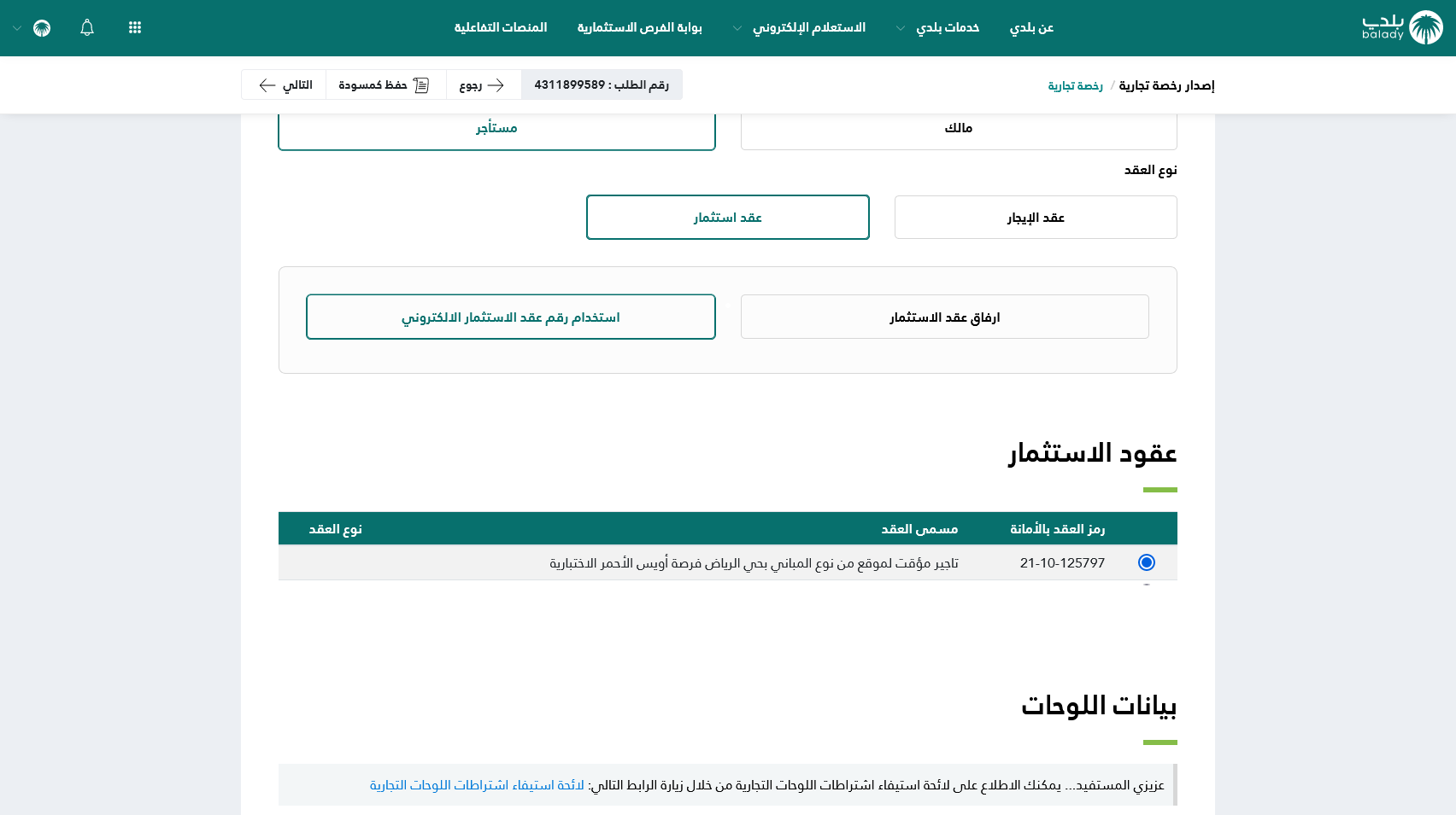 وبعدها يتم الضغط على الزر (التالي)، مع إمكانية حفظ الطلب كمسودة للرجوع إليه لاحقًــا وذلك من خلال الزر (حفظ كمسودة)، وإمكانية العودة للمرحلة السابقة من خلال الزر (رجوع).