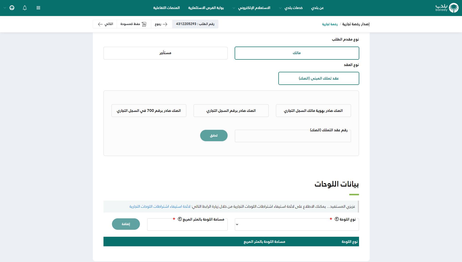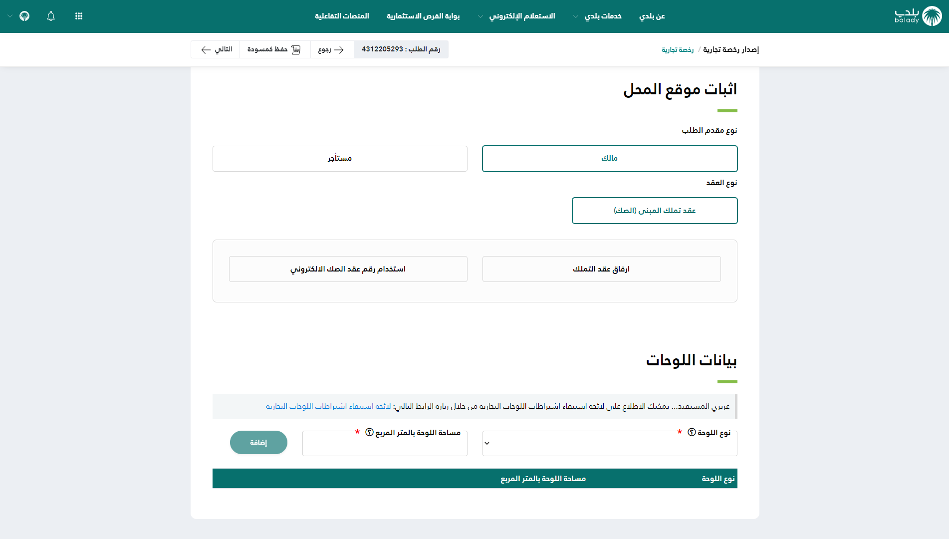 25) ثم يتم إثبات موقع المحل من خلال اختيار نوع مقدم الطلب (مالك، مستأجر)، وفي حال تم اختيار الخيار (مالك) يظهر للمستخدم الخيار (عقد تملك المبنى (الصك)) كما في الشكل التالي.