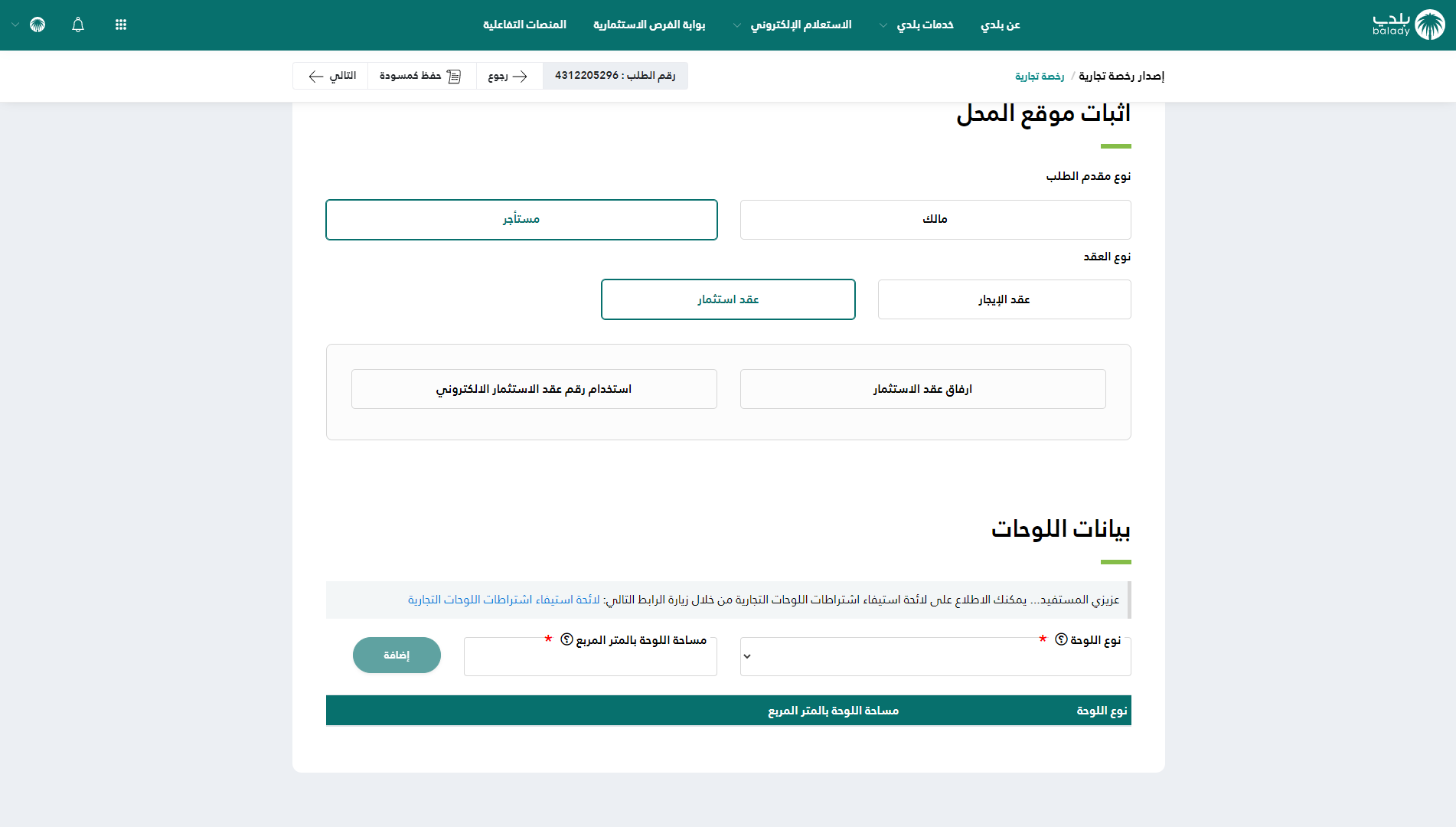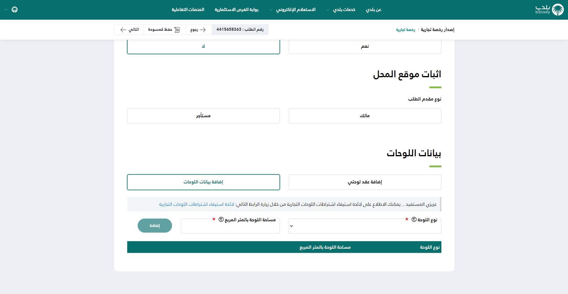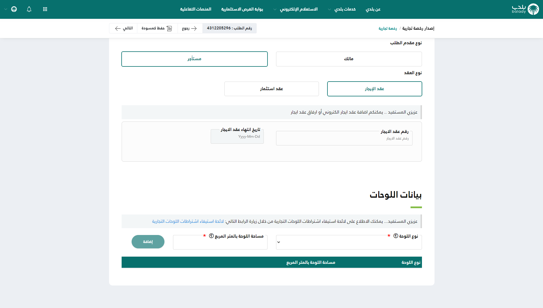37) في حال تم اختيار منطقة مفعَّــــل عليها الإعداد الخاص بعقد لوحتي - كما في المثال التالي - يظهر الخيار (إضافة عقد لوحتي) في قسم (بيانات اللوحات).
