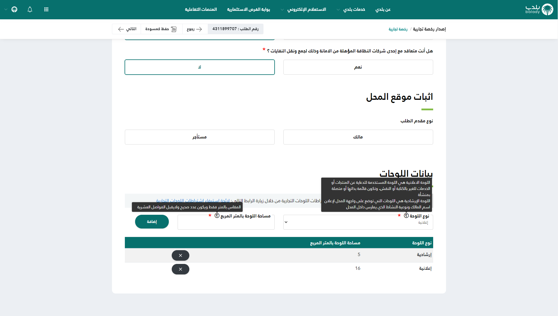 35) ويمكن للمستخدم إضافة لوحات من خلال اختيار نوع اللوحة من القائمة المنسدلة (نوع اللوحة) وتشمل (إرشادية، إعلانية)، وإدخال قيمة الحقل (مساحة اللوحة بالمتر المربع)، ثم الضغط على الزر (إضافة).