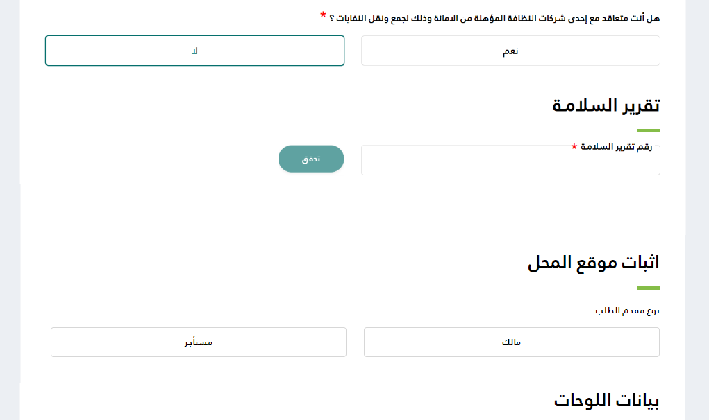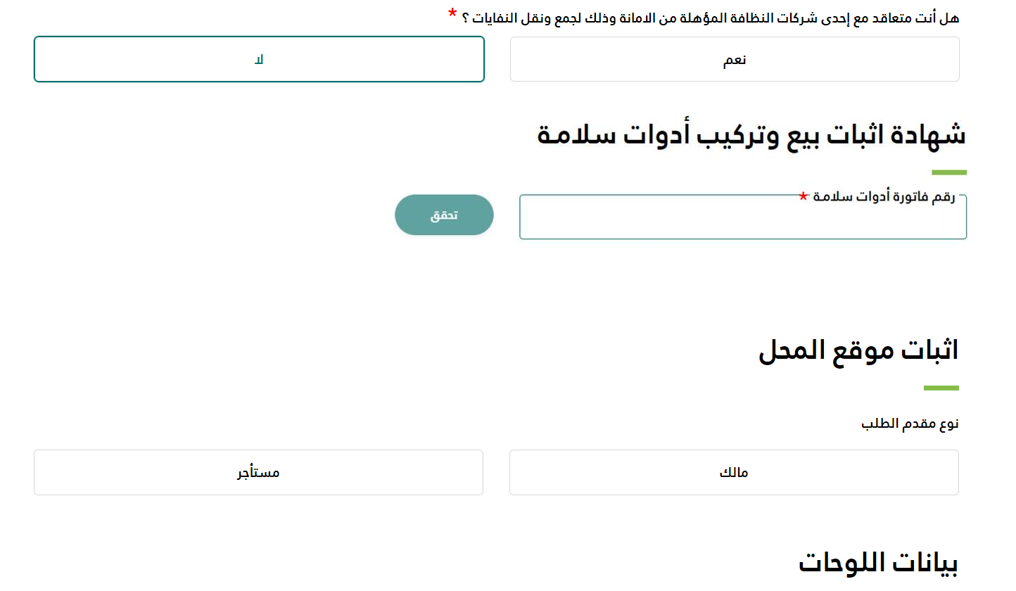 وفي حال تم اختيار القيمة (نعم) للسؤال (هل أنت متعاقد مع إحدى شركات النظافة المؤهلة من الأمانة وذلك لجمع ونقل النفايات)؛ سيظهر حقل جديد باسم (تاريخ انتهاء عقد النظافة) ليتم اختياره من الرزنامة الإلكترونية.