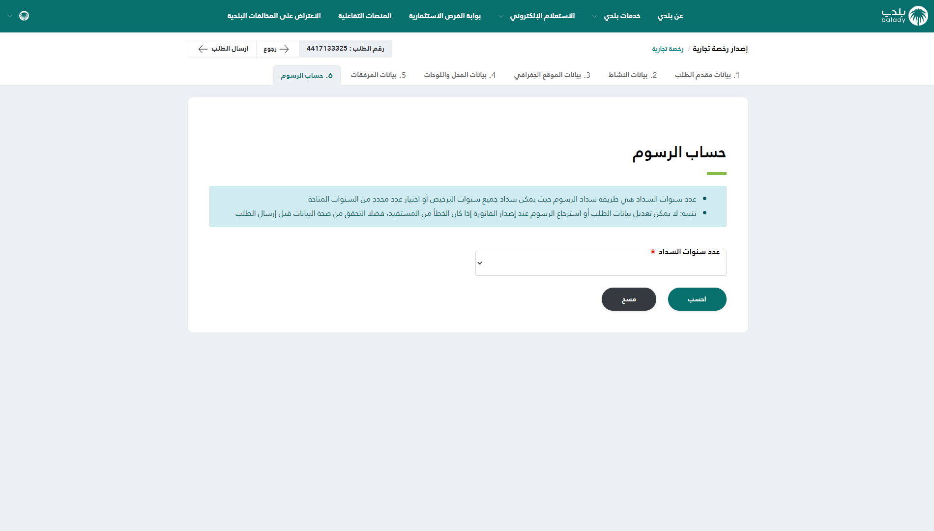 43) ثم ينتقل المستخدم لمرحلة (حساب الرسوم)، حيث يتم اختيار قيمة القائمة المنسدلة (عدد سنوات السداد) ثم الضغط على الزر (احسب) ليقوم النظام بحساب تكلفة الرسوم الإجمالية.