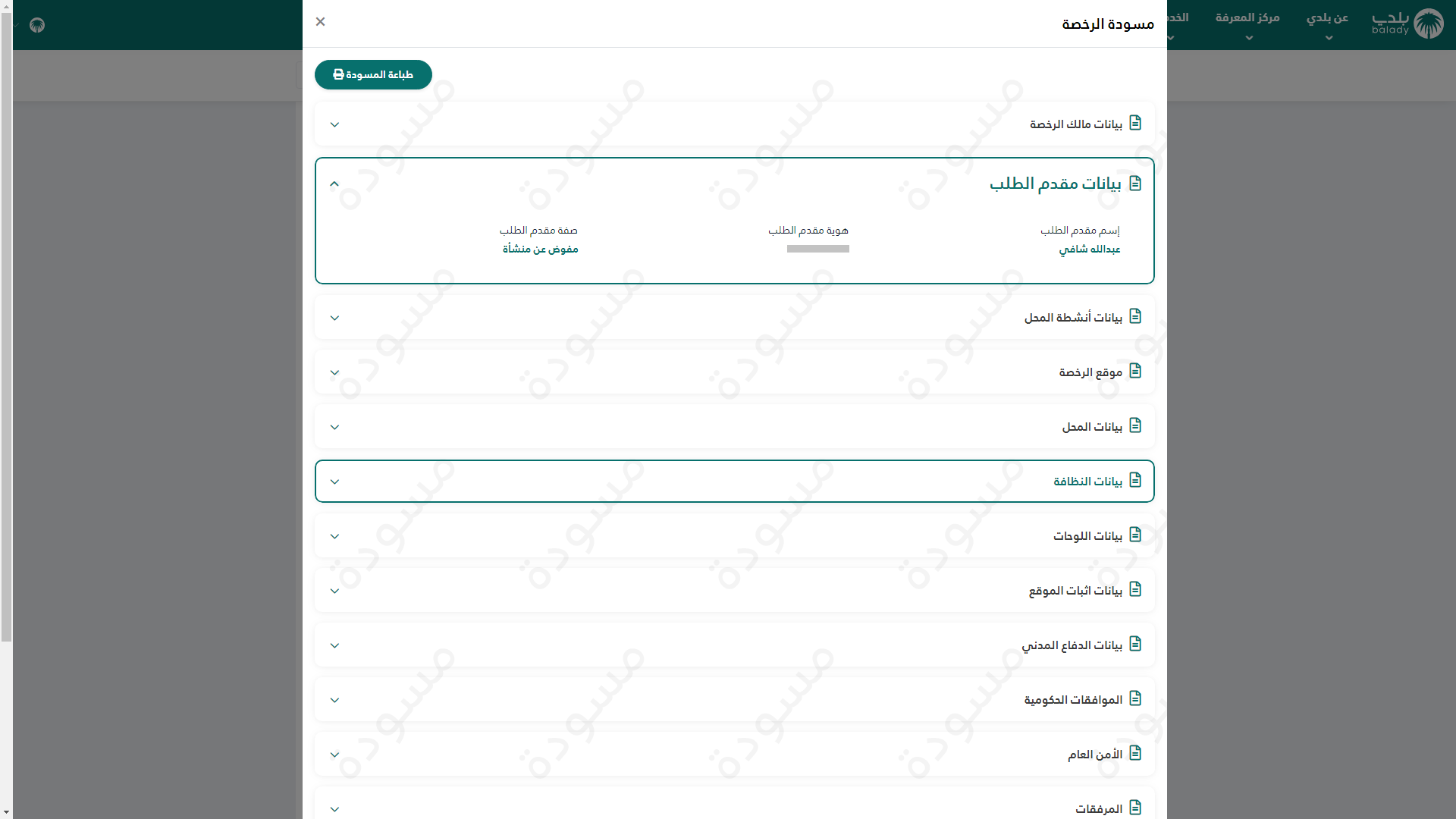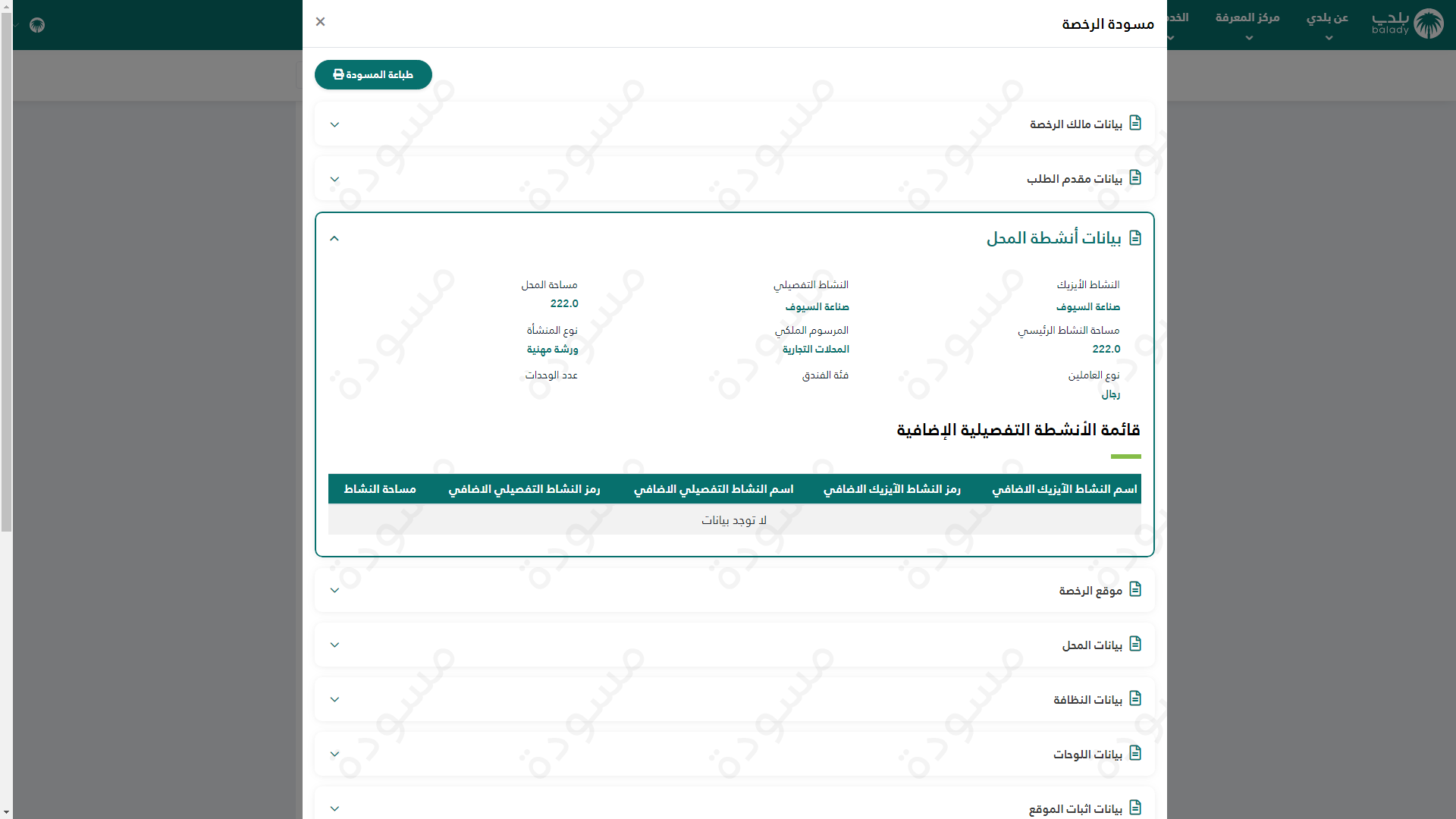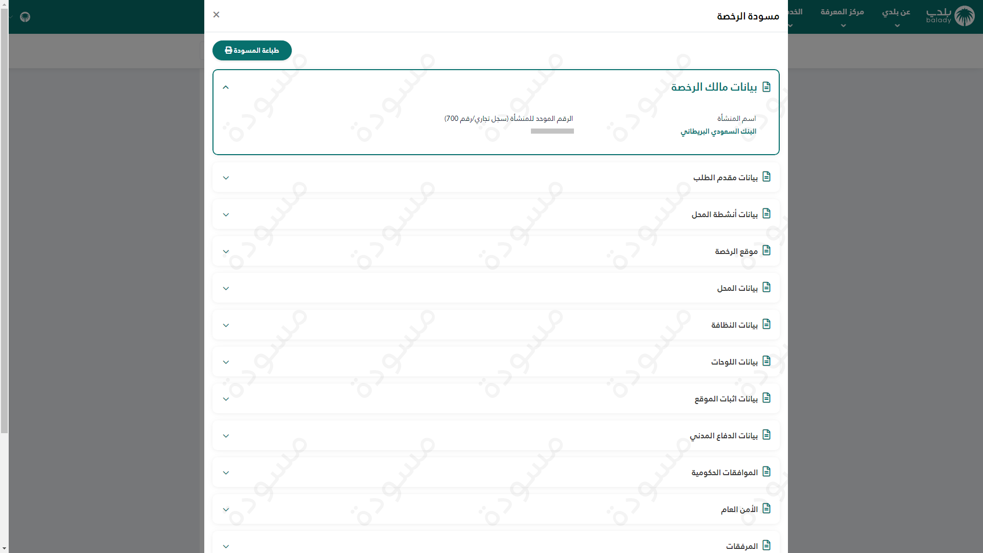 ويمكن من خلال الزر (مسودة الرخصة) أن يتم عرض جميع بيانات الرخصة المدخلة.